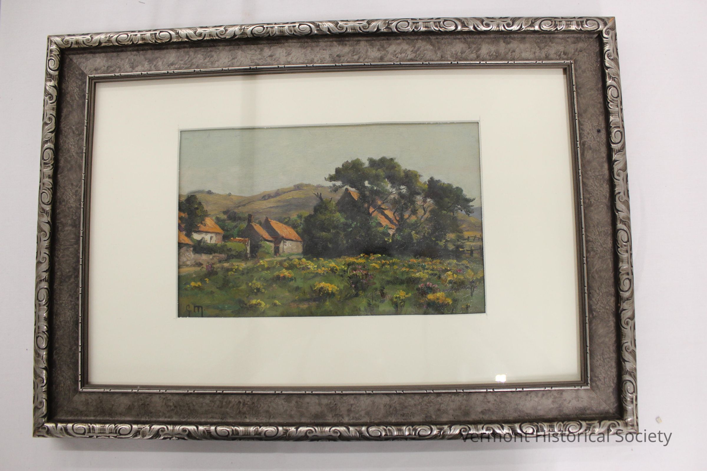 Oil painting of a rural scene in a silvertone, wooden frame and a white mat. Initialed "GM."Context