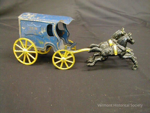 Cast-iron toy post office carriage. The body of the carriage is painted blue and the wheels are painted yellow. The body of the carriage is rectangular with raised, molded escutcheons on either side. A yellow shaft extends from the center front of the carriage's front axel and connects it to two black horses posed to be running. They each have a small wheel attached to one of their front feet.Context