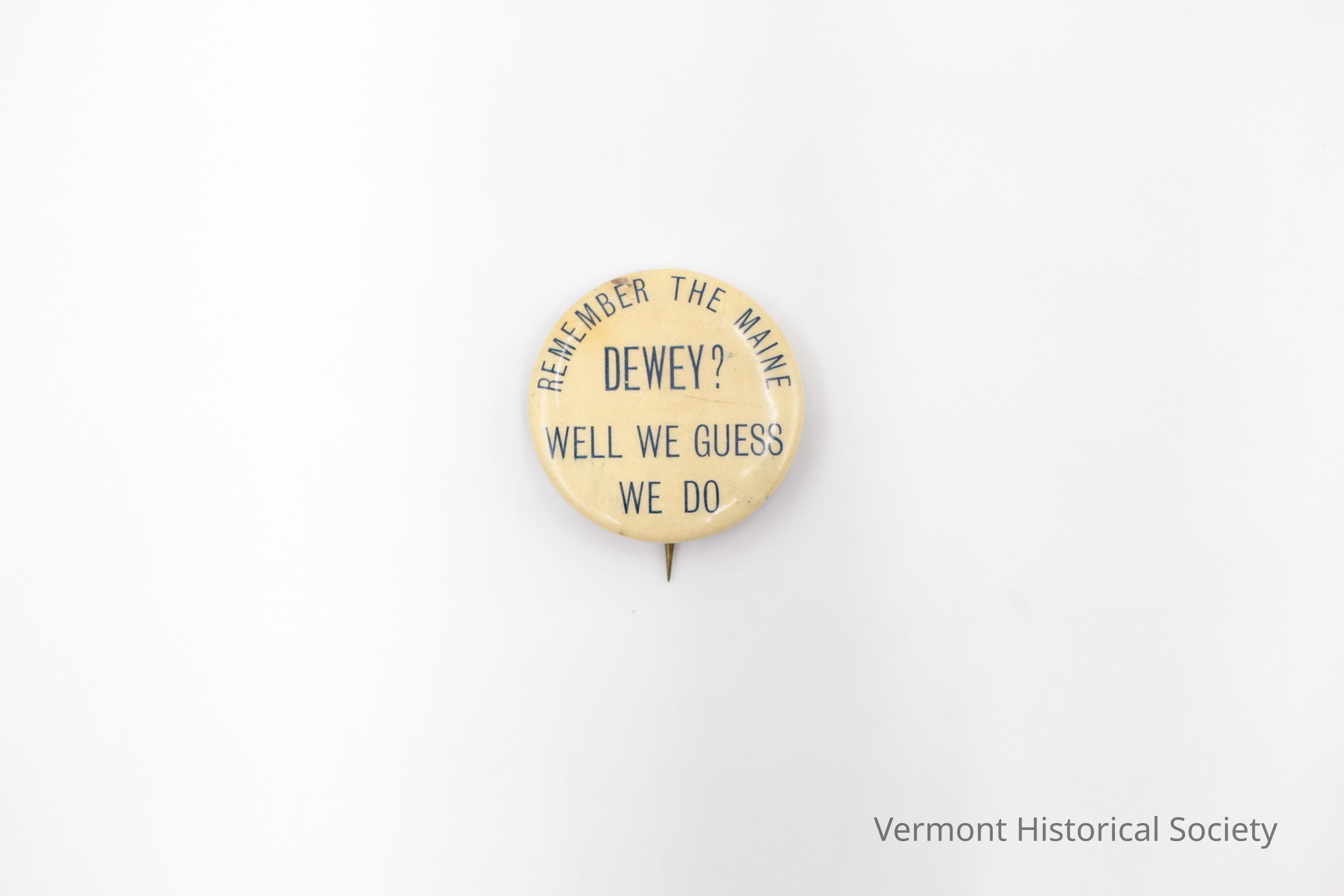 Cream-colored metal button with the blue inscription, "REMEMBER THE MAINE DEWEY? WELL WE GUESS WE DO"Context