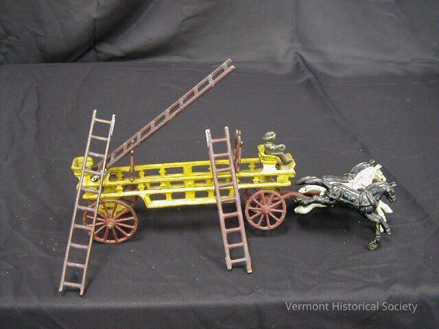 Cast-iron toy fire truck consisting of a cart, three ladders, a driver, and three horses. The cart is long and rectangular, with red spokes for holding ladders. The ladders are painted red. There is a bench at the front and back of the cart, and a driver on the front bench. A red shaft connects the wagon to three horses: one painted white, and two painted black.Context