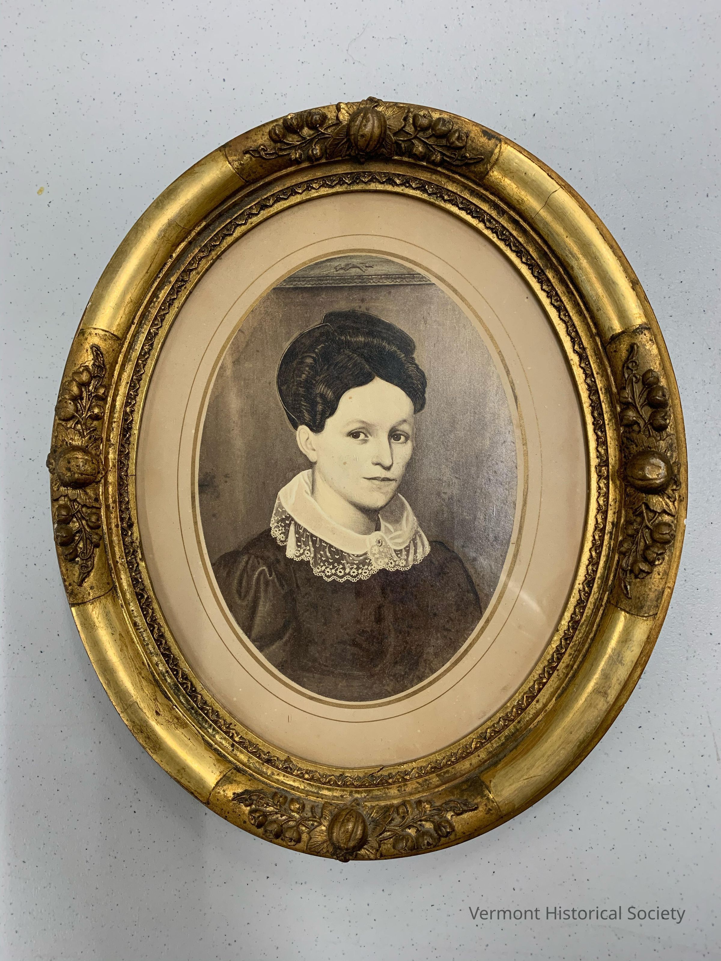 Painted photograph of a portrait. The portrait shows a young woman wearing a high-waisted, black dress with puffed sleeves and a high, white fall collar embellished with lace. The portrait is cut in an oval and pasted onto a white mat, with two lines of gilding tracing the outline of the applied portrait. The whole is framed in a gilded oval frame embellished on the top, bottom and sides with molded melons and vines.