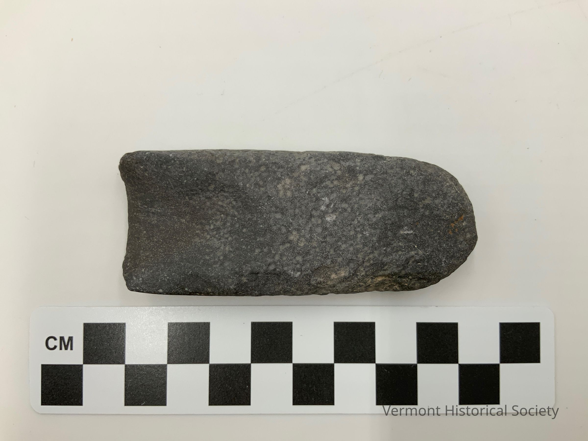 Gray ground stone gouge. The surface is pecked except for a groove on one side that is ground and polished. One side is ground into a blade. Both ends show evidence of use.Context