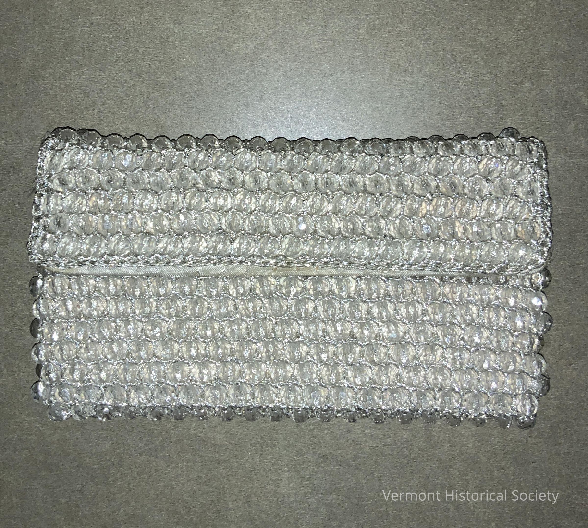 Purse with large glass beads and silver yarn that runs through and around the beads and along the edges. The interior is silvery white satin or silk and there is a snap closure.