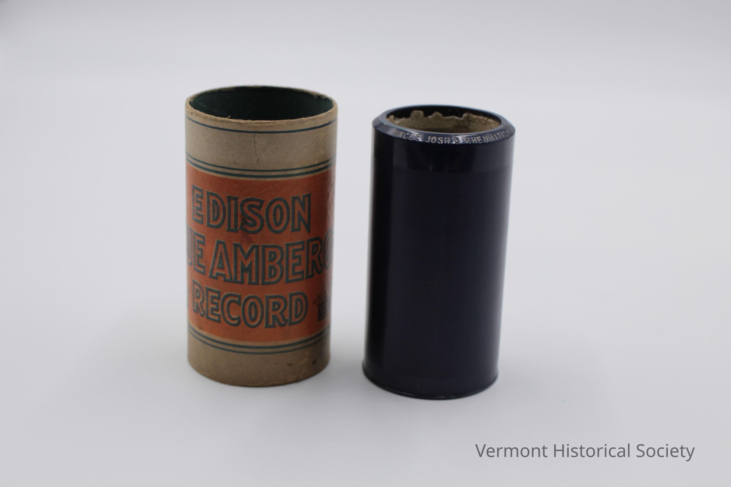 Black phonograph cylinder with a cardboard case. The cylinder, or "record", is a hollow cylinder consisting of hard, blue, ridged celluloid around a concrete core. One edge of the cylinder is labeled in white with the words, "UNCLE JOSH'S RHEUMATISM CAL STEWART / Thomas A Edison PAT'D. 24."Use