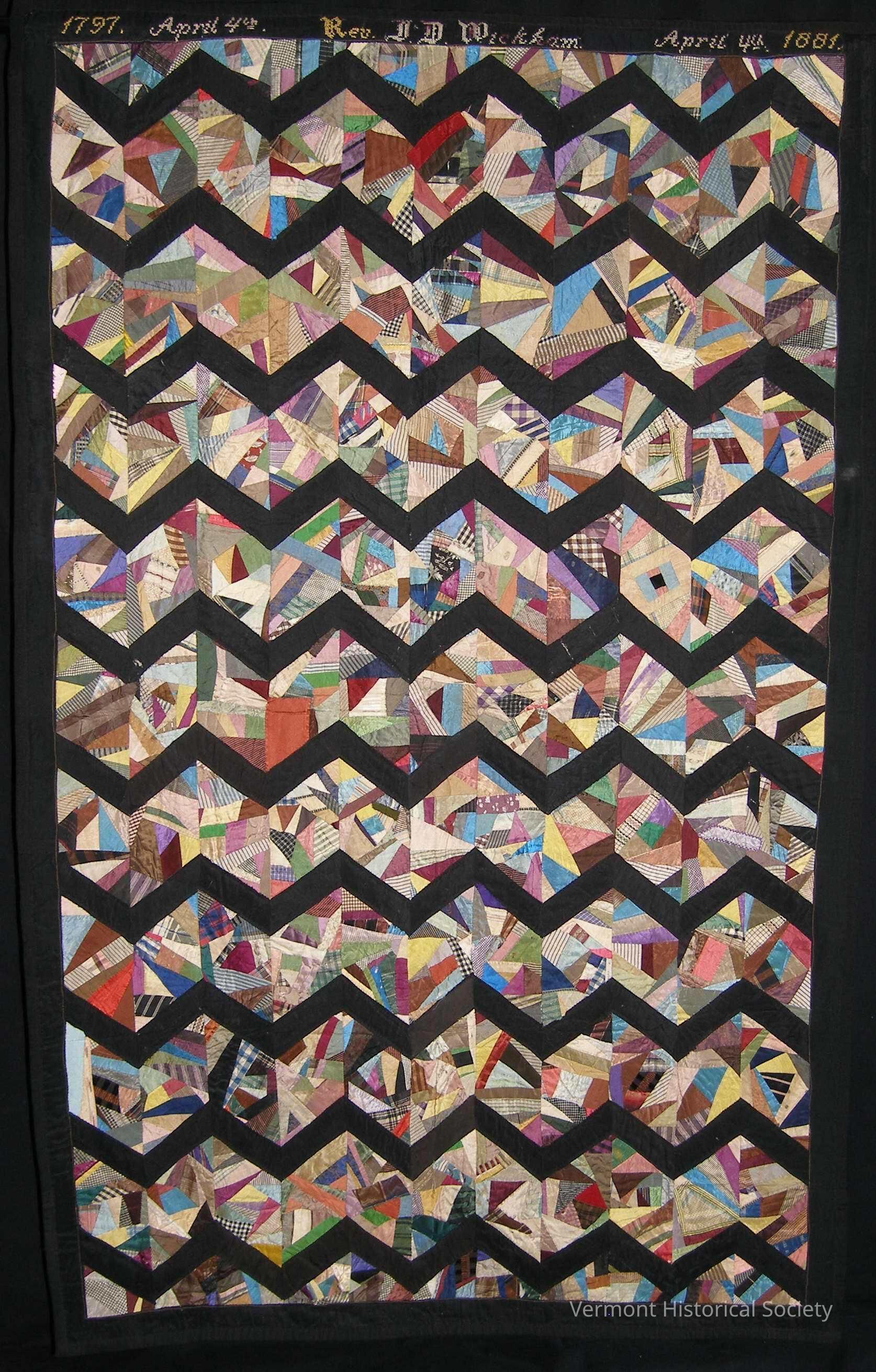 Silk crazy quilt assembled in zig-zags with black banding. Fabrics include solids, stripes, and plaids. The zig-zags are created by piecing crazy-pieced parallelograms together. The top is marked, "1797. April 4th. Rev J. D. Wickham. April 4th, 1881." in cross stitches.Context