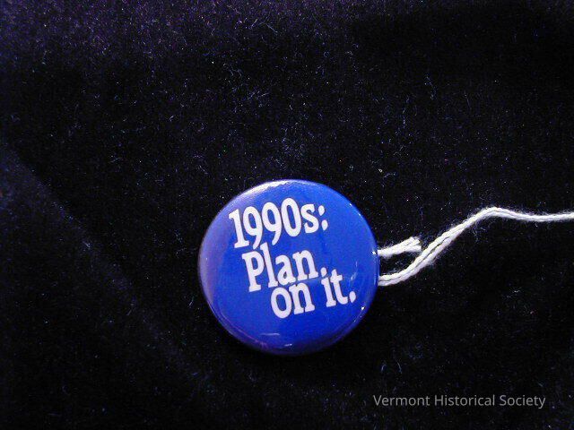 Round blue button with the white words, "1990: Plan on it."