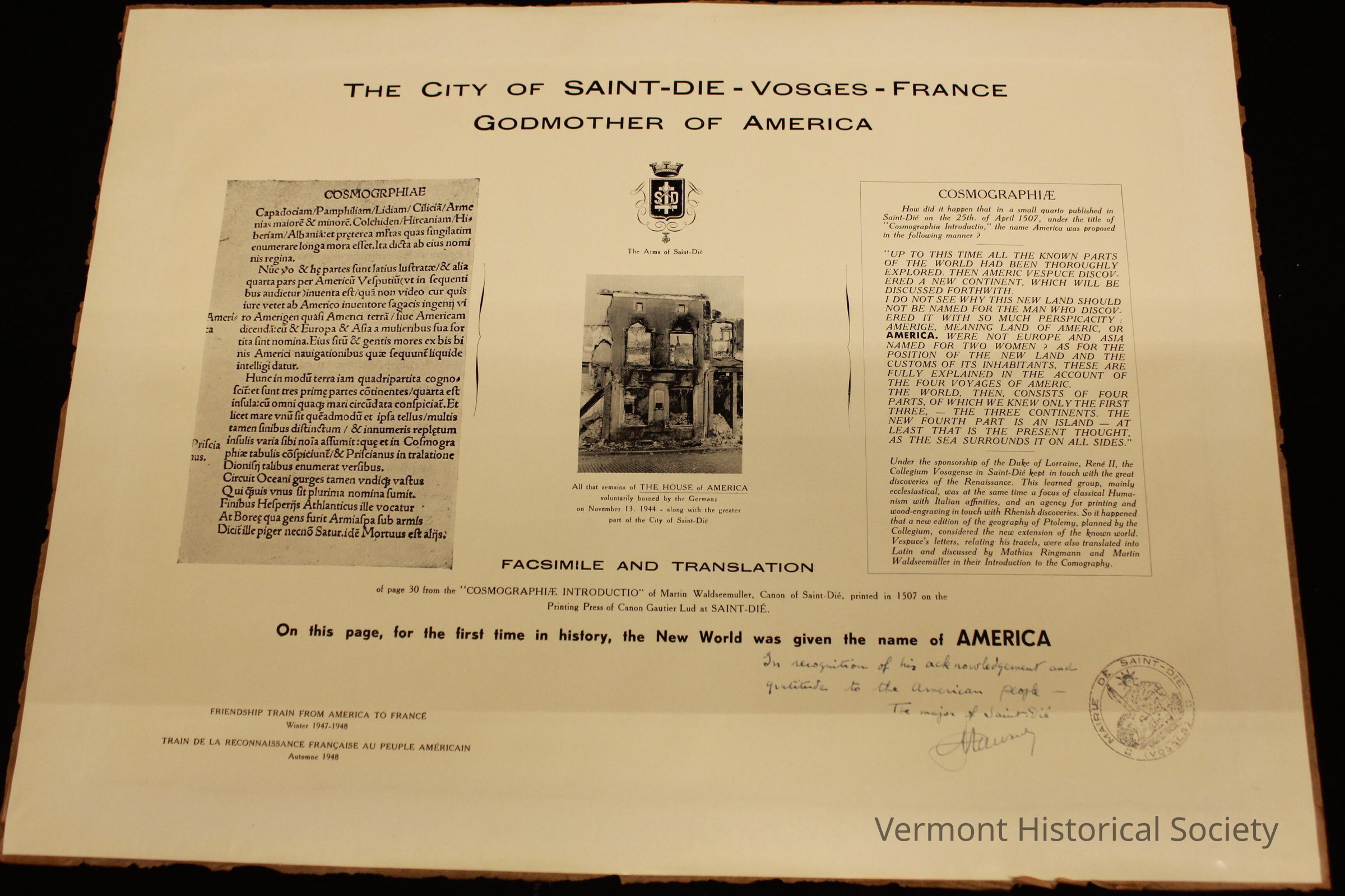 A black and white poster that explains the history of the name "America" from a publication from April 25, 1507. One side has a copy of the early document and the other side has an English translation. The poster came from the mayor of Saint-die-Vosges, France.Context