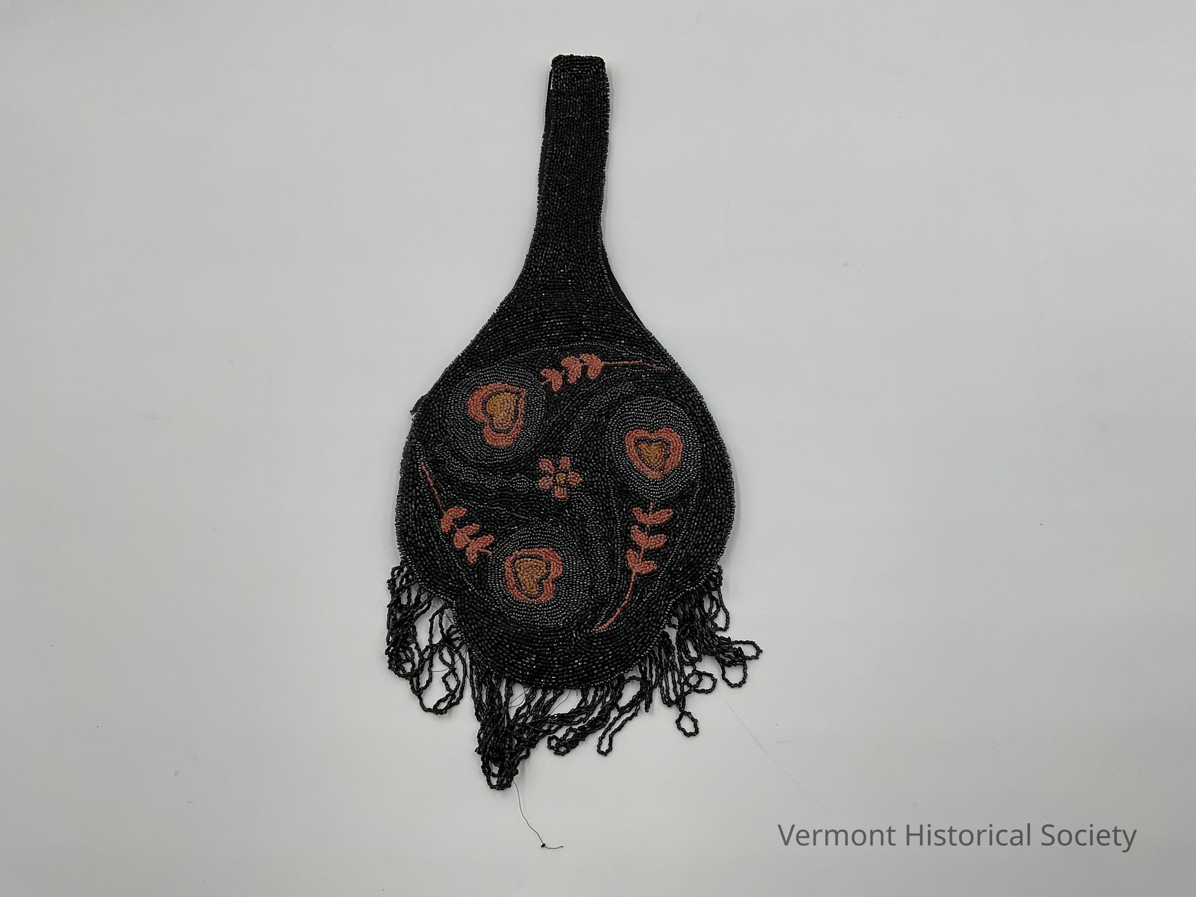 Elaborately beaded black purse in tear-drop shape with a handle. The design features heart-shaped, orange flowers and stems. The bottom of the purse has dangling bead loops.