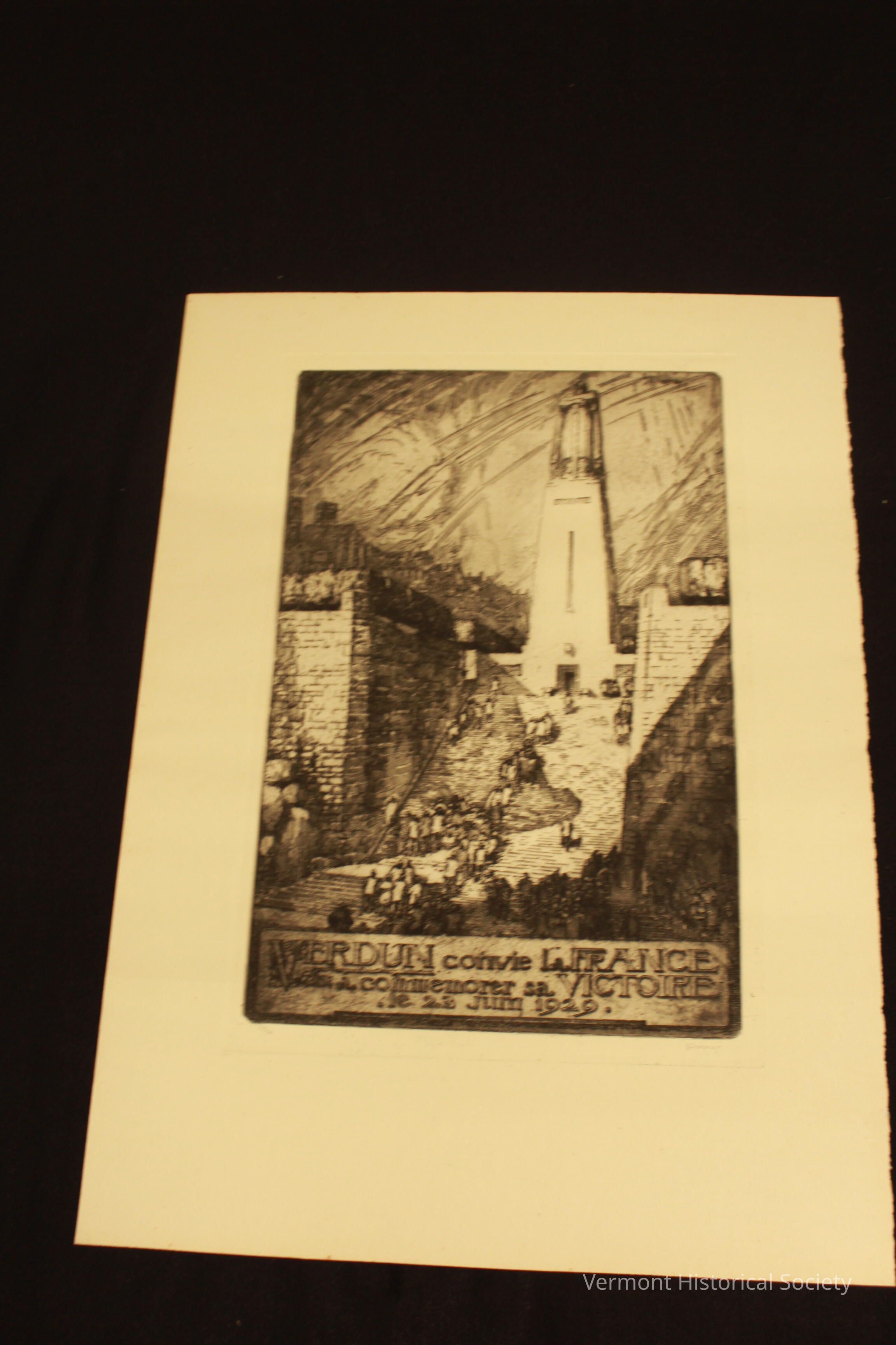 Print of an etching of a tower, signed by L. Chesnay.Context