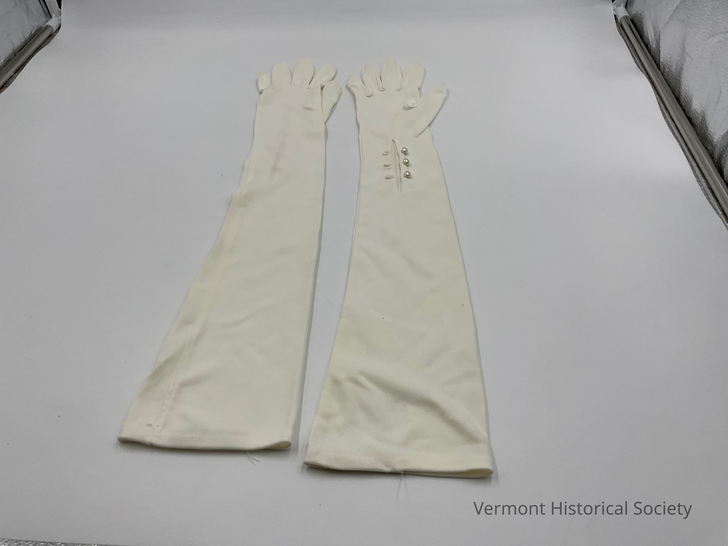 Long nylon evening gloves. At the wrist on the palm side is a slip with three pearl-like buttons on one side and buttonholes on the other side.