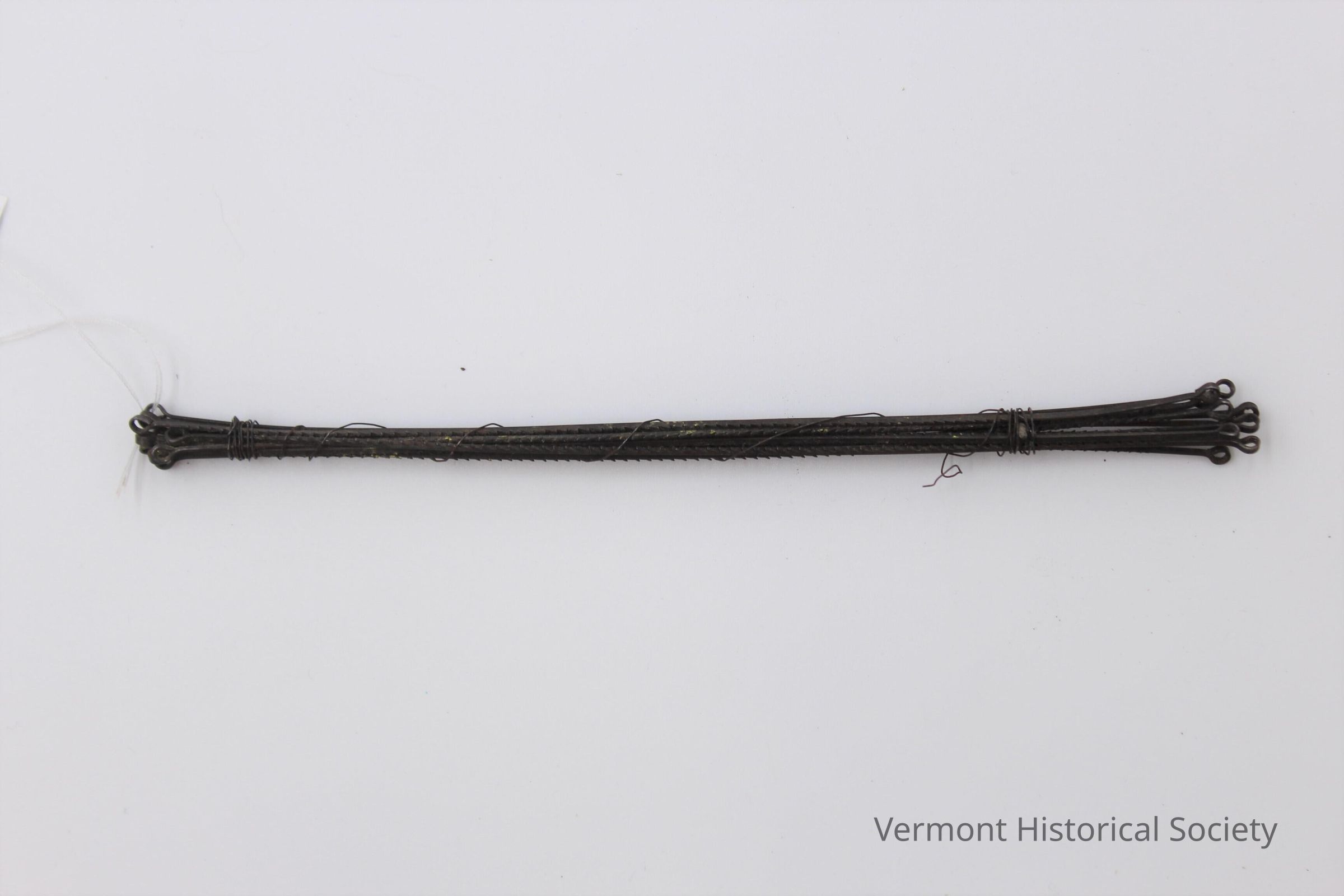 10 very thin saw blades with fine teeth. There is a loop at either end for attaching to a saw. They are bundled together with a thin wire.Context