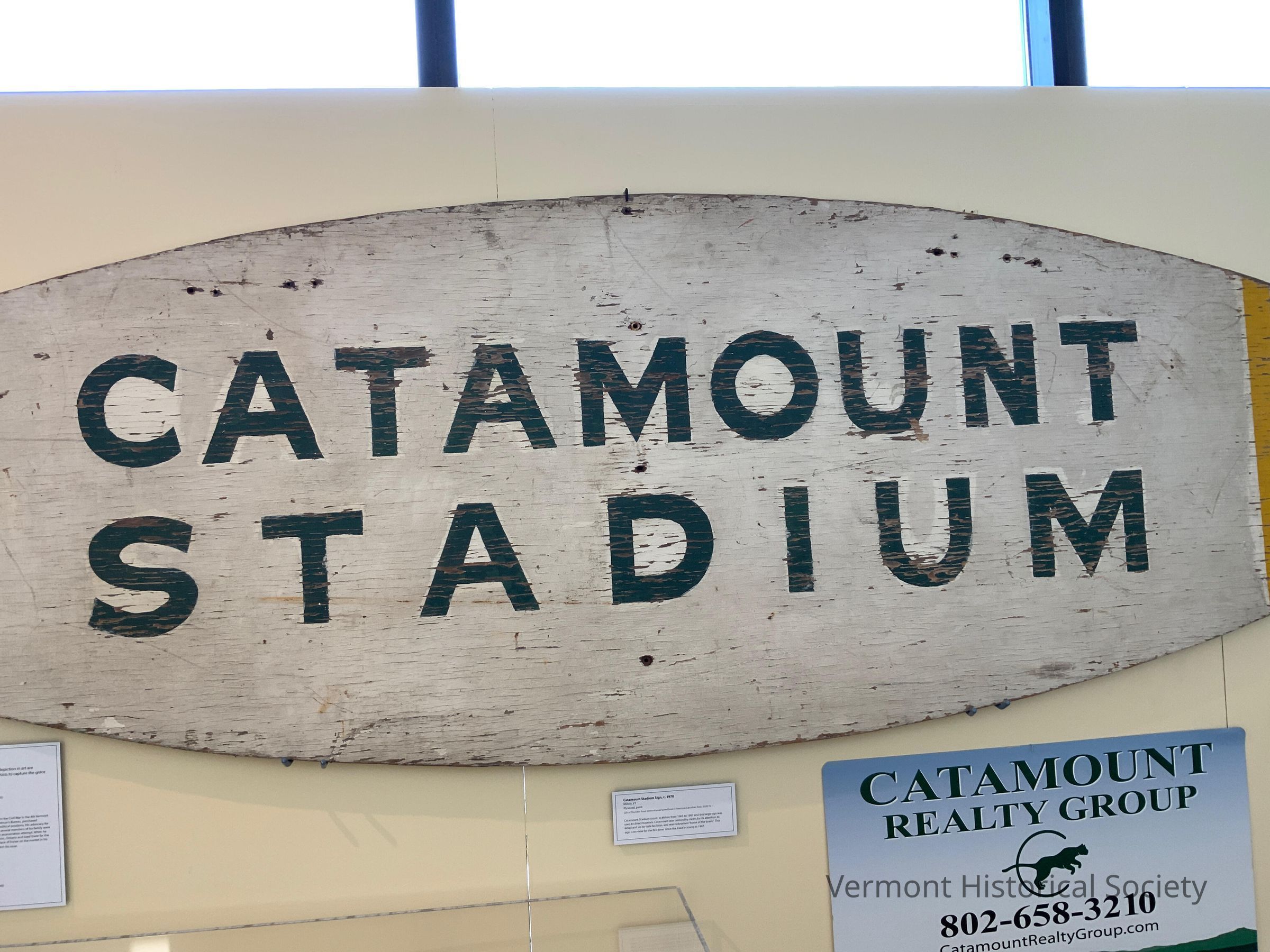 Large, oval plywood sign. The sign is painted white with the black inscription, "CATAMOUNT STADIUM". The ends of the oval are cut off to create straight edges, and are painted with yellow vertical stripes.