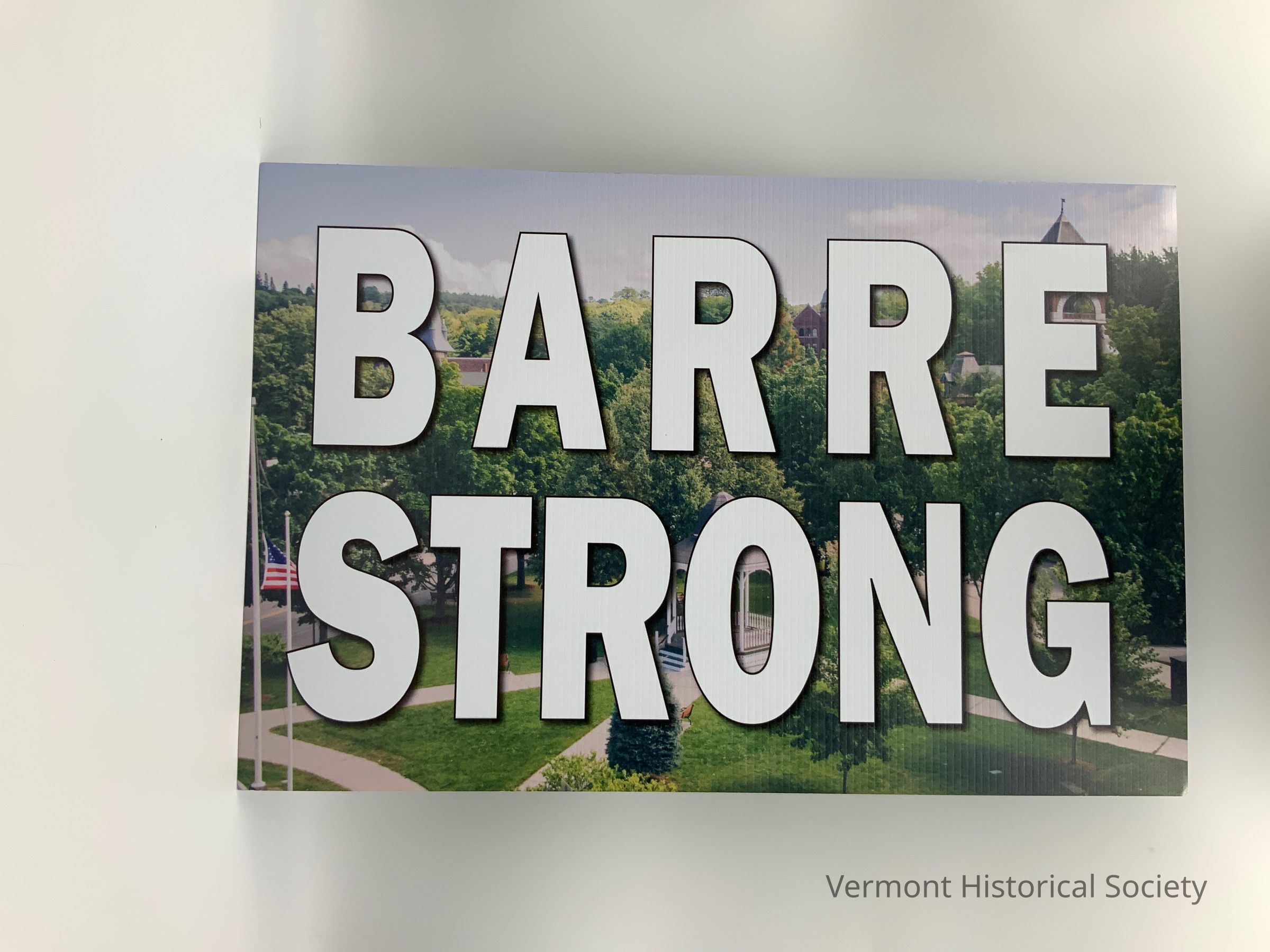 A two-sided sign that features a picture of the park in downtown Barre with the words "BARRE STRONG" printed atop the scene in bold, white lettering. The other side is green with white printing that says, "DONATE TO THE BARRE COMMUNITY RELIEF FUND/BARRE STRONG". There is a qr code in the top left corner.