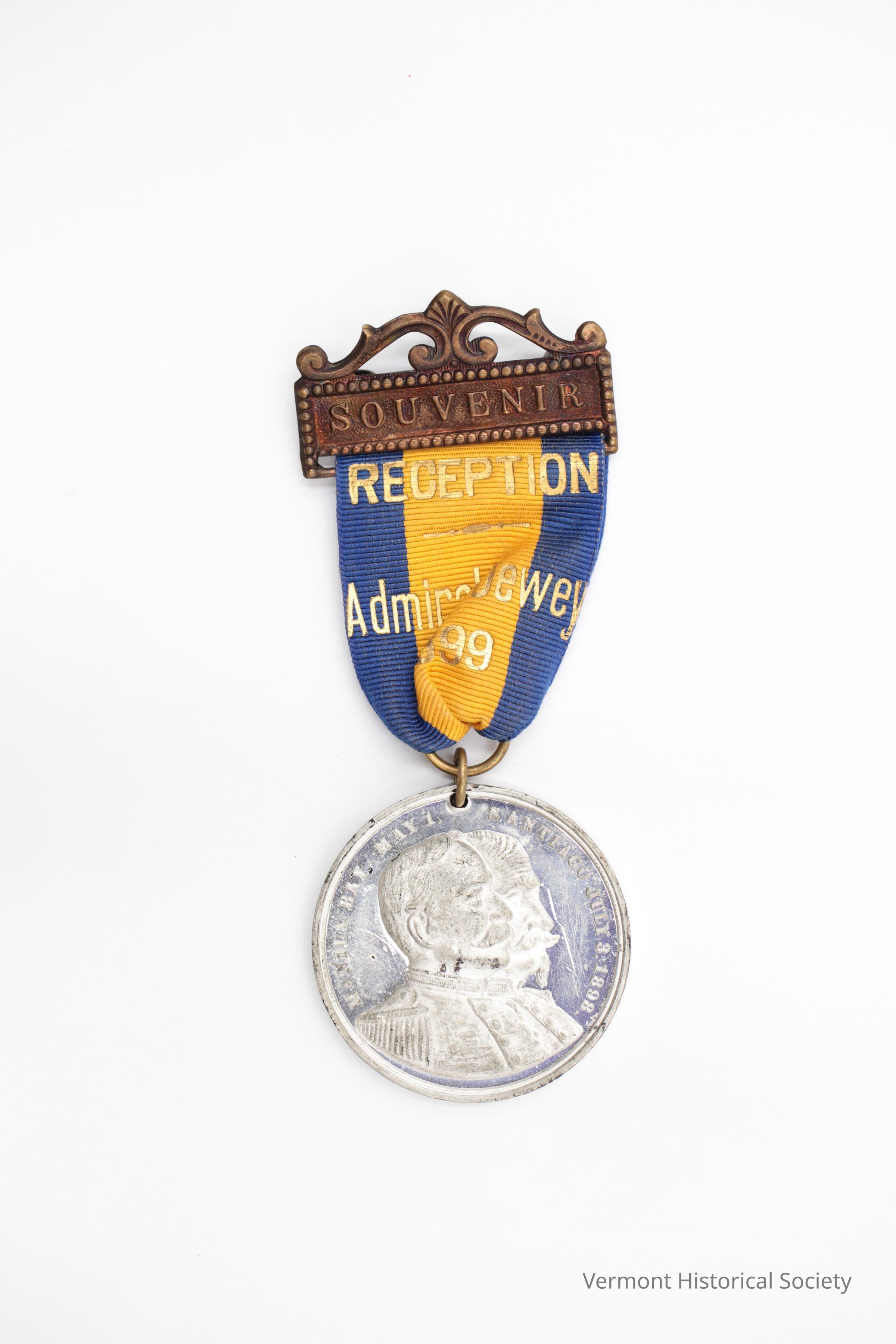 Commemorative medal consisting of a bar, a ribbon, and a medallion. The bar is copper and is molded with the word, "SOUVENIR." The grosgrain ribbon is striped yellow (center) and blue (edges) and is printed in gold with the words, "RECEPTION Admiral Dewey 1899." The medallion hangs from an eye ring looped through a larger eye ring looped through the ribbon. It shows the bust of Admiral Dewey and another man surrounded by the words, "MANILA BAY MAY 1. SANTIAGO JULY 3. 1898." The back of the medallion shows the inscription, "YOU CAN COMMENCE FIRING AS SOON AS YOU ARE READY / MAY 1. 1898. / THERE IS GLORY ENOUGH FOR ALL / JULY 3. 1898." within a square frame over a laurel wreath.Context