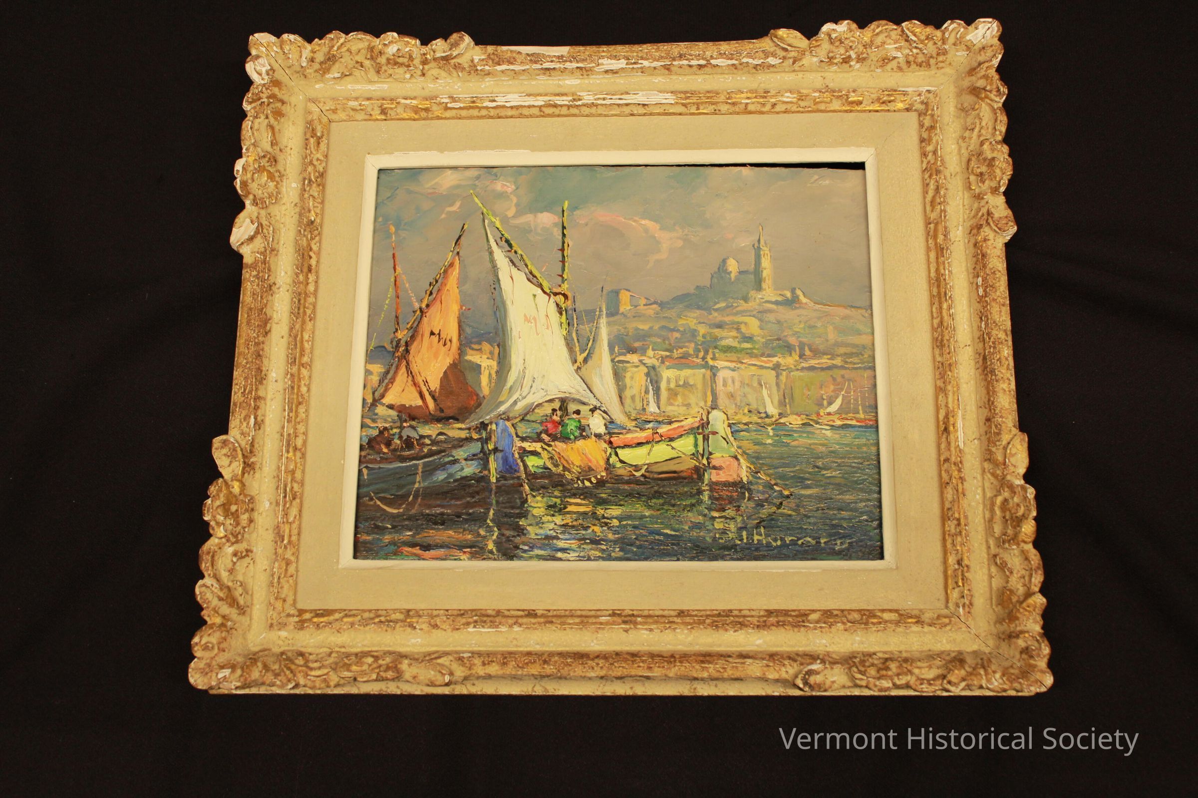 Oil painting on wood of sailboats with a church on a hill in the background. card on the back said Moullot, objects d'art et de fantasie, gallery, Marseille. Frame is gold, ornate and chipped.Context