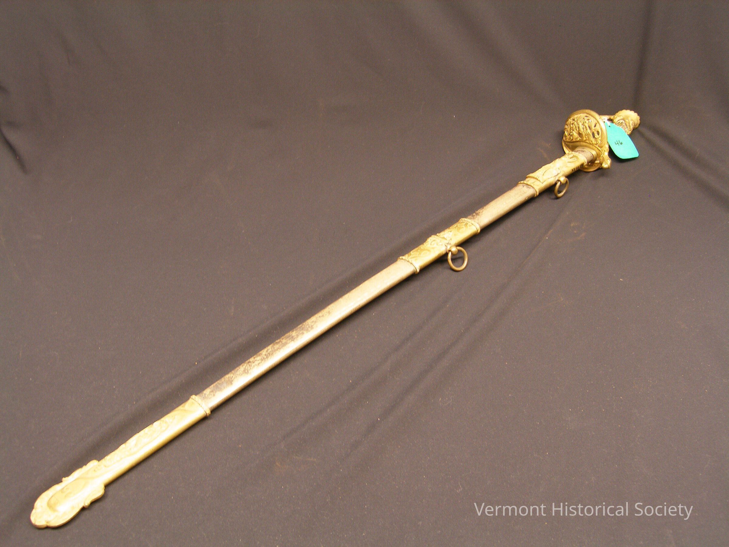Straight bladed sward with scabbard. The grip and guard are both elaborately decorated gold, molded and engraved into flowers and military emblems. The blade is engraved with flowers, and the scabbard is engraved with the names of battles and the inscription, "CAPT. A. M. BEATTIE Comdg Co. F, 3d. Vt. Vols. by the members of his company as a mark of their confidence and esteem. Feb. 1864."Context