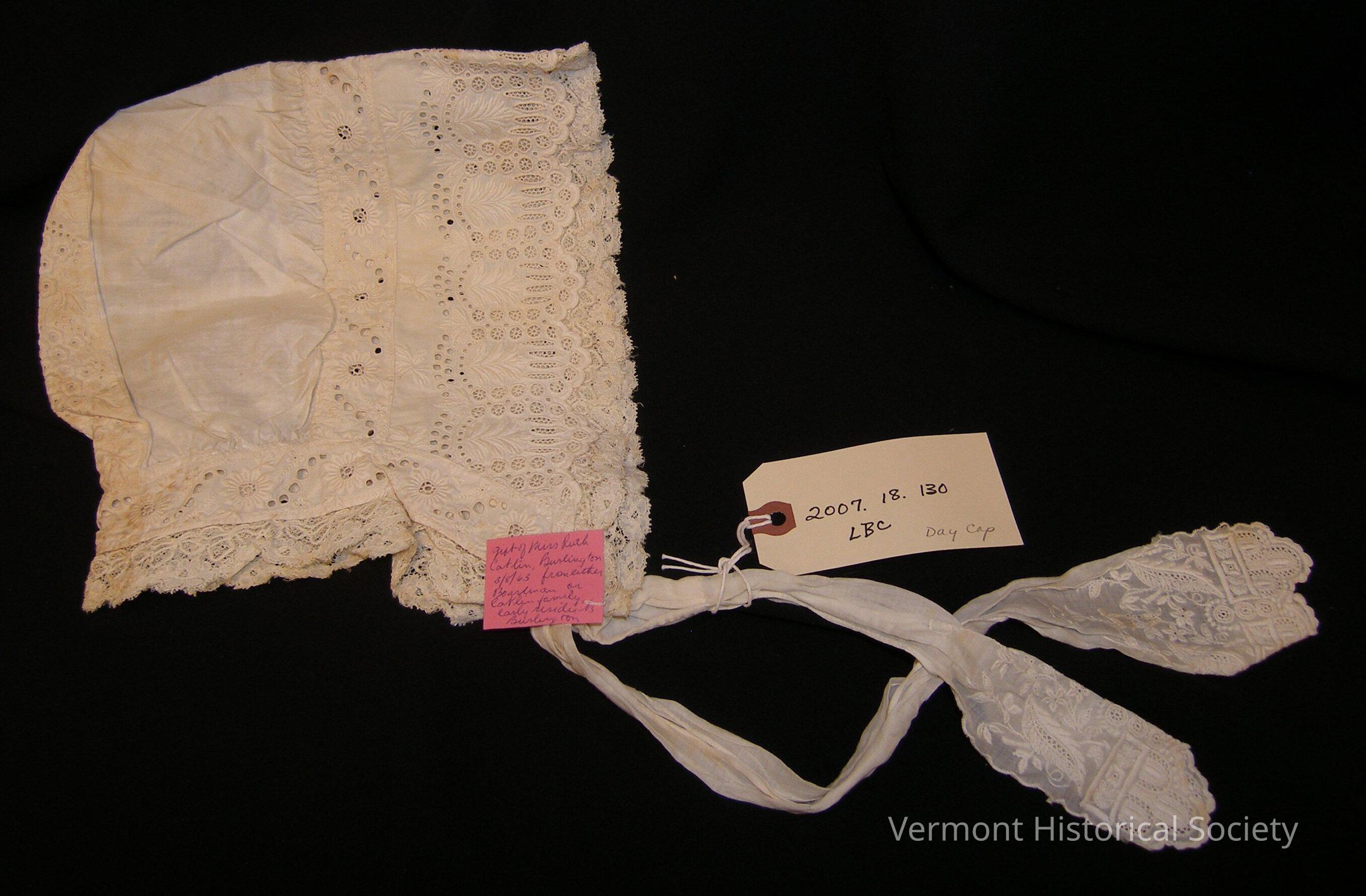 White cotton cap with a wide border embroidered with eyelets. There are 2 ties with whitework embroideryContext
