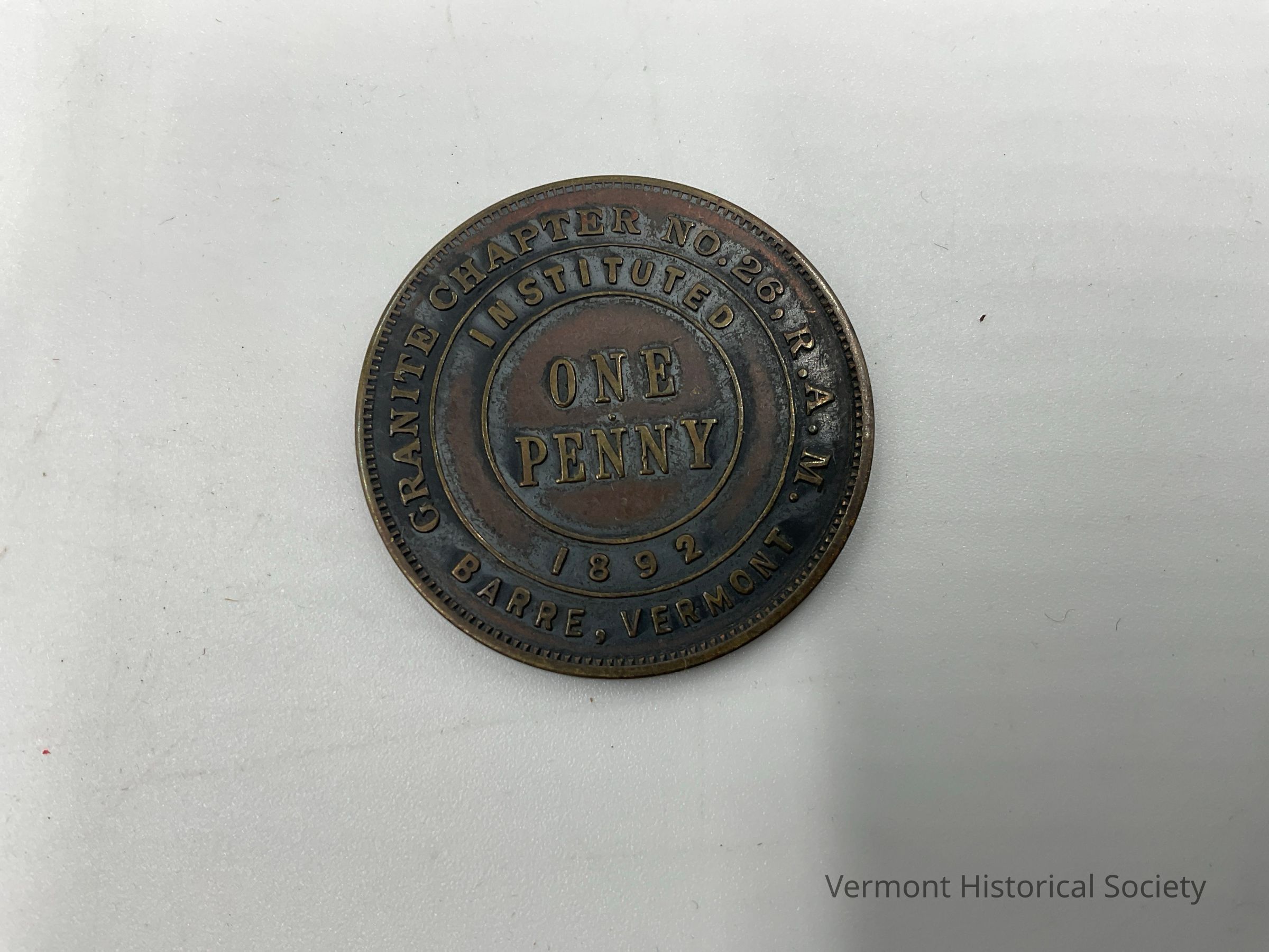 Masonic coin. The round coin is printed, "ONE PENNY" in the center of one side and "GRANITE CHAPTER NO. 26, R.A.M. / BARRE, VERMONT" and "INSTITUTED / 1892" around the edges. The other side reads "HTWSSTKS" in a circle at the center with the Masonic keystone with a hammer and chisel on either side. The abbreviation stands for "Hiram, Tyrian, Widow's Son, Sent to King Solomon" signifying loyalty in Masonic teachings.Context