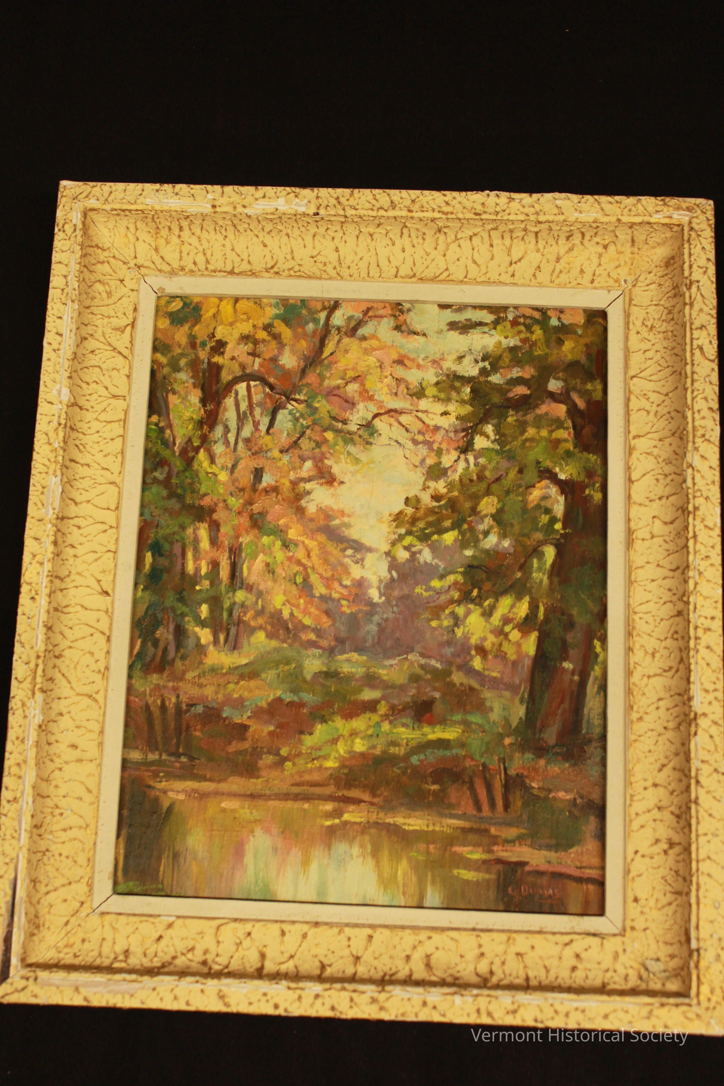 Oil painting of a woodsy scene in fall with a pond or stream in the foreground. Artist is A Dumas of Bordeaux. It is framed in gold and cream and the finish is chipped.Context
