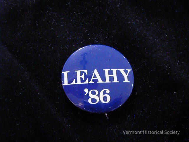 Blue campaign pin with white lettering that reads, "Leahy '86."