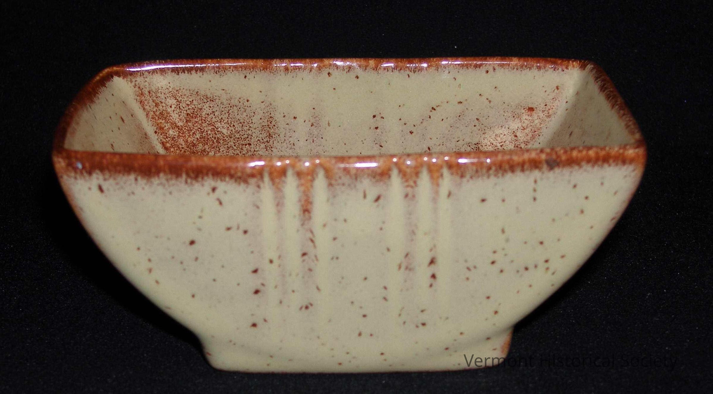 Short vase with a rectangular base and rounded side corners. The vase has a green glaze mottled with brown spots. The two long sides are impressed with six vertical lines. The bottom is marked "S. Ballard 33" and "Vermont 42".