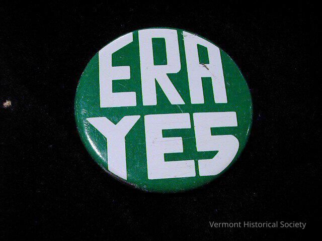 Green button with bold white lettering that reads, "ERA YES" from the 1986 campaign to add an equal rights amendment to the state constitution.Context