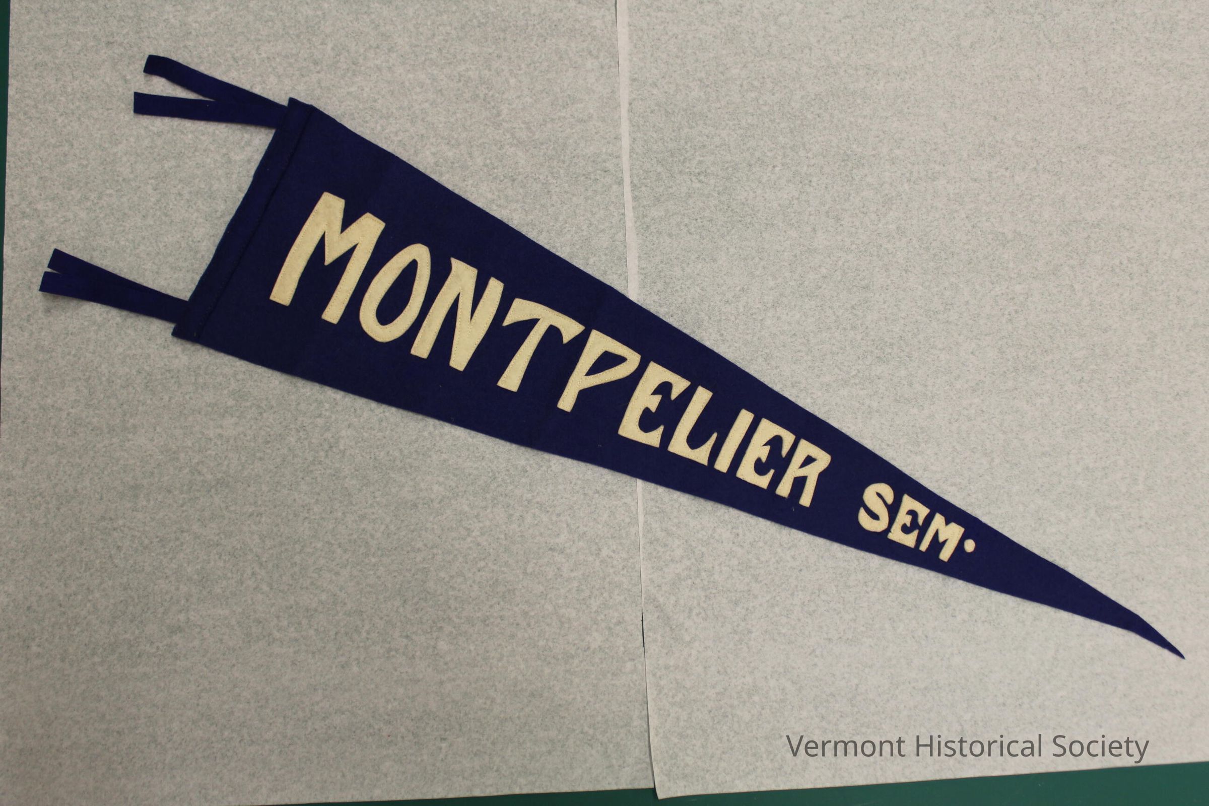 Montpelier Seminary pennant from 1925. Blue with white letters graduating in size: "MONTPELIER SEM." Tag on back reads: "A PRODUCT/ OF/ GREEN MOUNTAIN/ STUDIOS/ White River Junction, Vt." Two streamers on wide end.