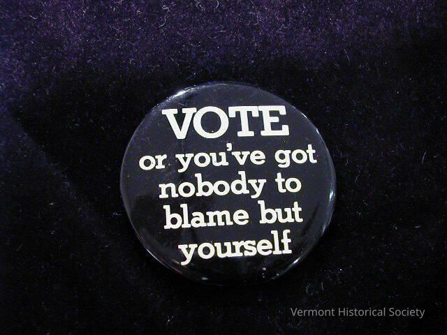 Round black button with the white words, "VOTE or you've got nobody to blame but yourself".