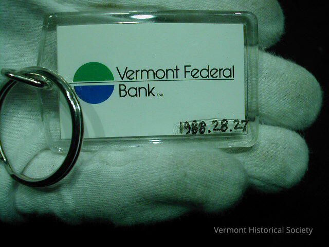 Round metal key ring attached to a clear plastic tag. Encased within the tag is a white piece of paper printed with the words, "Vermont Federal Bank".