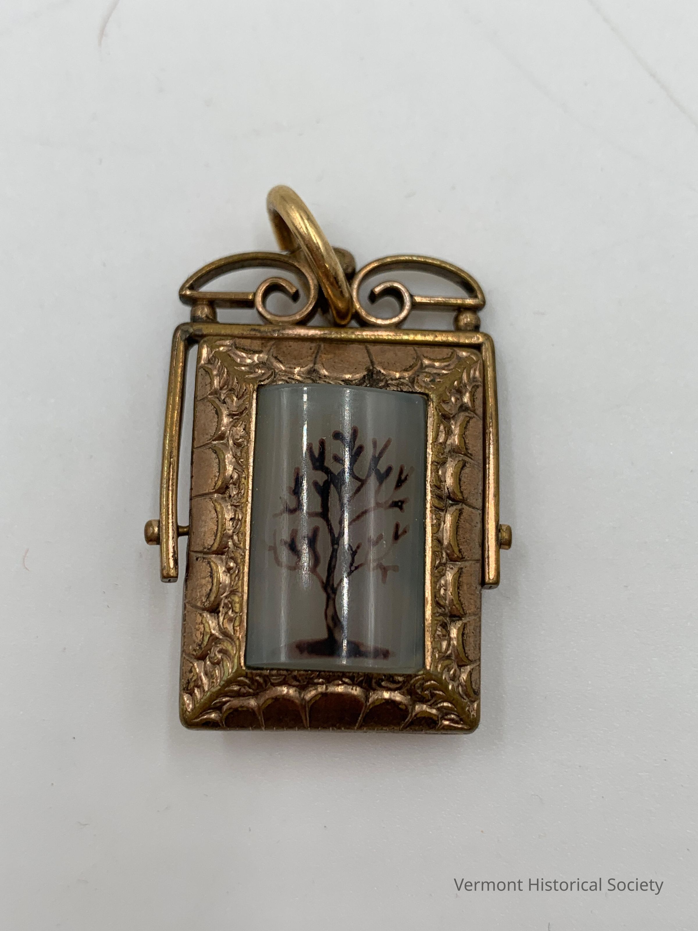 Rectangular, gold-plated watch fob with a stone in the center. The fob consists of a central frame holding to rectangular stones, each showing on the opposite side. One side shows a white stone with a convex face painted with a brown tree with no leaves. The other shows a brown stone with a convex face; the stone contains several light-colored inclusions. The frame is molded with shell shapes and attaches to an outer frame at two connections points at the center; it can spin around the connection points, allowing either side of the stone to be in the front. The outer frame has scrollwork at the top and an eye ring.Context
