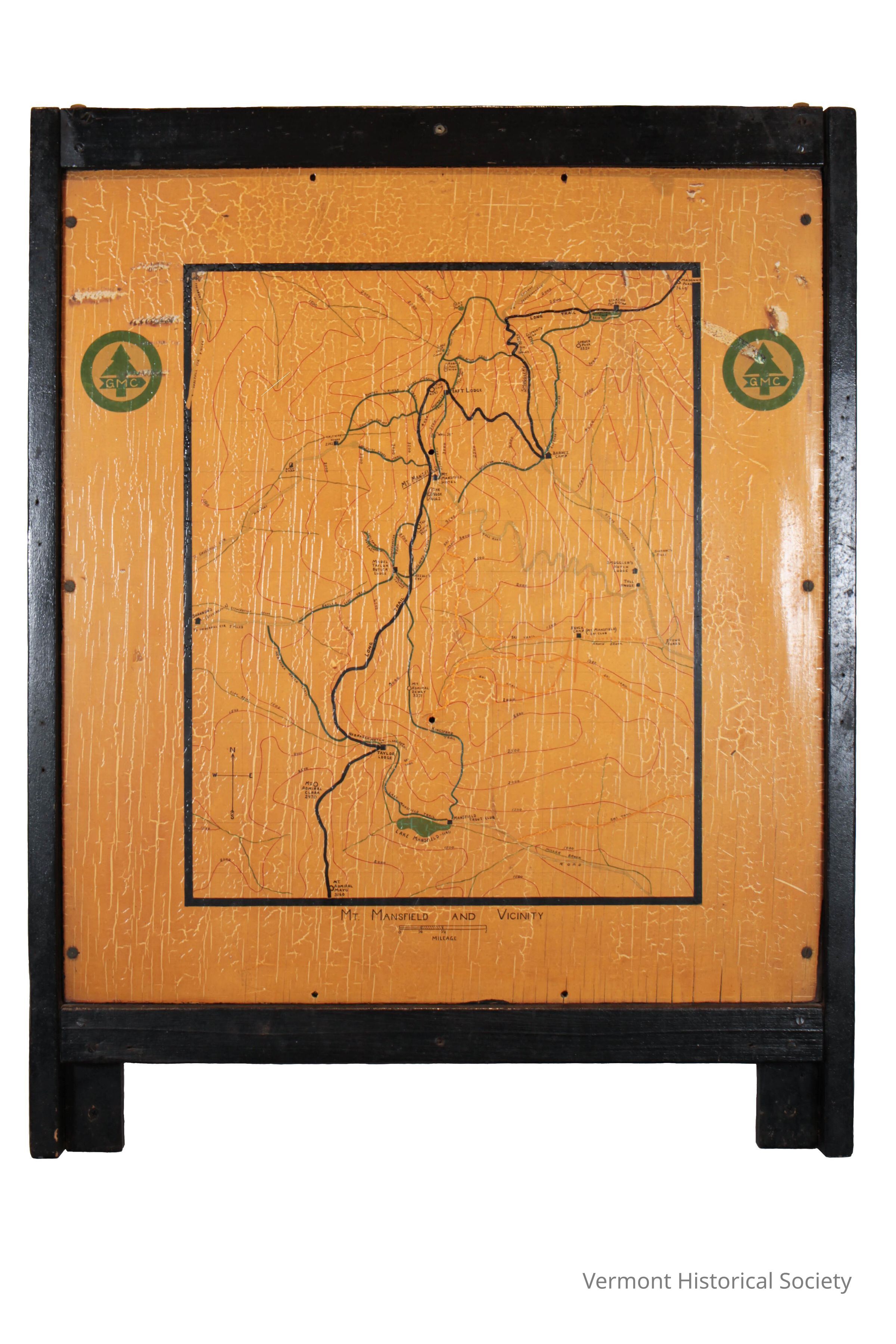 Yellow sign framed in black and printed with an elevation map of Mt. Mansfield with the Long Trail and other trails marked. Taft Lodge and other lodges are also marked. The Green Mountain Club logo--a pine tree in a circle with GMC--is shown twice. A small title under the map reads "MT. Mansfield and Vicinity" The scale for this map is 1/2mile = 1 1/2". Written on the back is the inscription, "This map painted c. 1940 by Elton Ray Beal (1897-1971) of 77 Pomeroy St.., Burlington, VT. He was employed by the Engineering Dept. of the University of Vermont, and was an active member of the GMC."Context