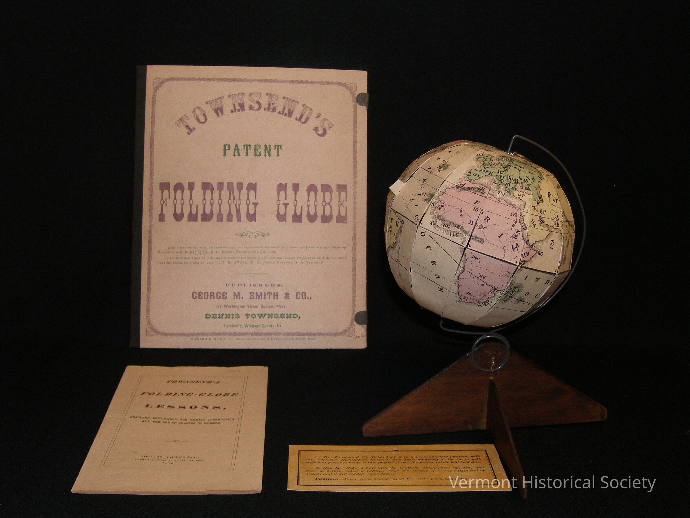 Collapsible paper globe and accessories. The globe is made of paper, cut and printed in such a way that it can flatten into a disk or hang from a wire stand and be displayed round. It comes with a semi-circular wire mount on a triangular wooden base. The base is made of two, flat triangular pieces of wood that slide together in the center. It also come with an instruction card and a book of lesson plans.Context
