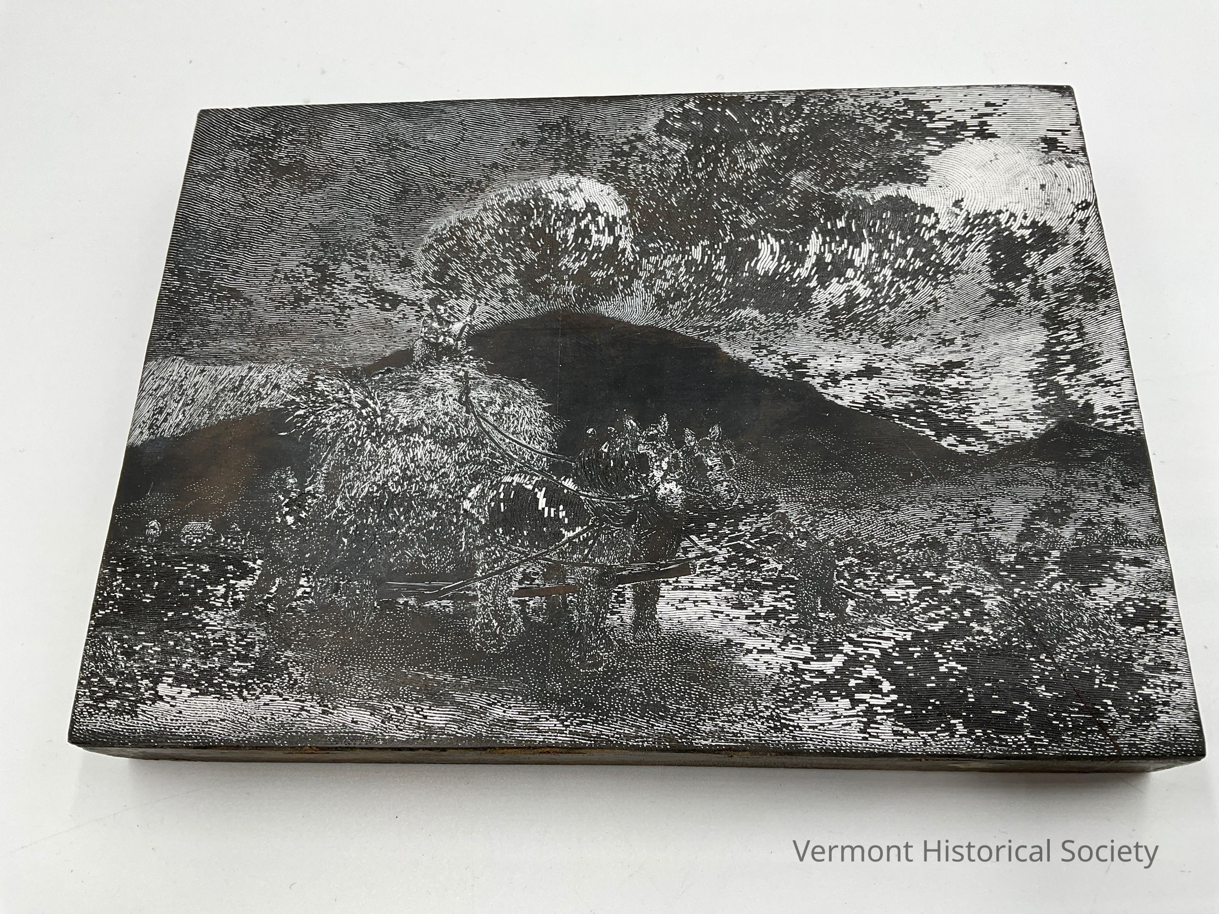 Woodblock carved in low relief with the reverse image of the print, "New England Storm". The image shows 3 people piling hay onto a cart. There are 2 horses hitched to the cart. 1 person is standing on top of the piled hay while another is adding more hay to the stack. The third is to the right of the wagon and is raking hay from the ground. The sky shows large clouds and right and dark clouds on the left. The back of the block is painted with the label "Grandma Surprise" along with 4 large Xs.