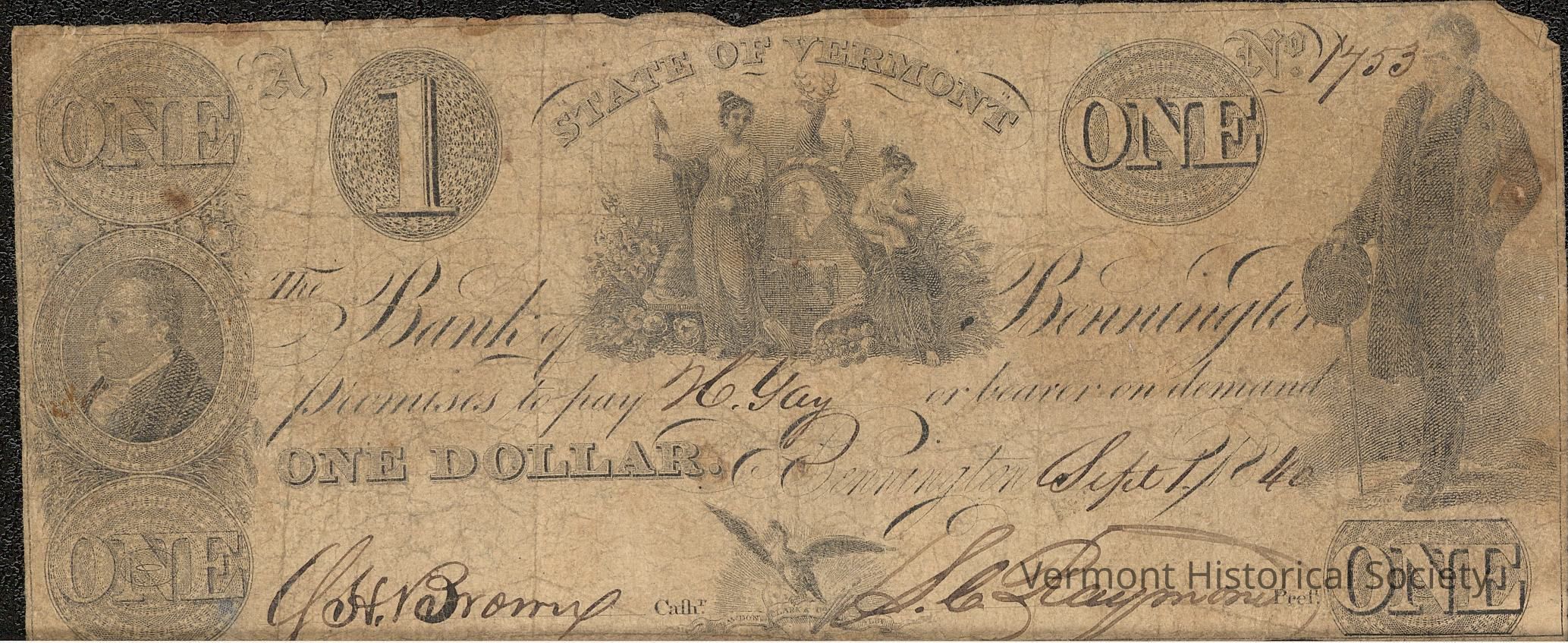 Private bank note for 1 dollar issued by The Bank of Bennington. It is printed with the number 1 in various formats, along with a bust portrait of a man (left), 2 women flanking the seal of Vermont (center), a full-length portrait of a man (right). It has the inscription, "STATE OF VERMONT / The Bank of Bennington promises to pay [H. Gay] or bearer on demand ONE DOLLAR. Bennington [Sept. 1.] 18[40]"Context