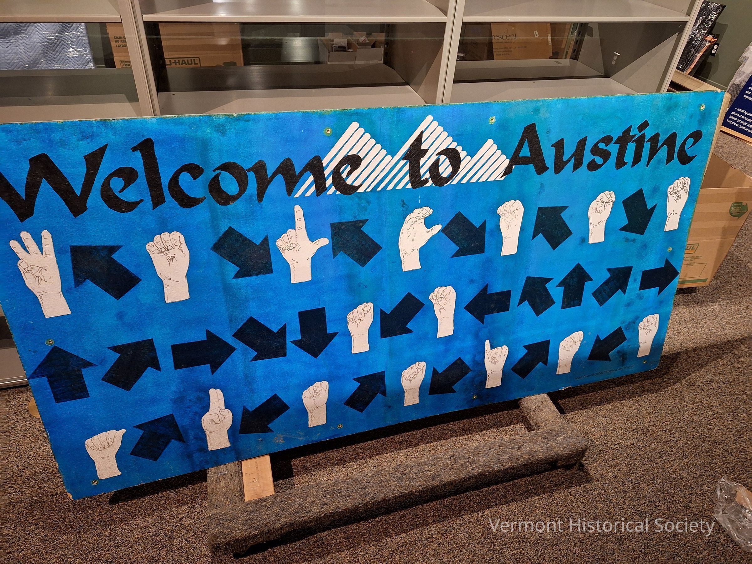 Painted particle board sign for the Austine School. The sign is painted blue over yellow and reads "Welcome to Austine" in black stylized print across the top with the school's tri-mountain insignia in white behind the center. Below the black text is the same phrase in sign language, with each hand painted bright white with lighter black lines for finger and hand position and definition, with arrows pointing in various directions to signify how one's hands should move when signing the letters. There are ten holes drilled around the sides to hang the sign up--four each on the top and bottom edges and one each at the center of each lateral side. The sign is inscribed, "Mural Created By Jaclyn. FP, Steven. C, and Wayne. T Spring 2003"Context