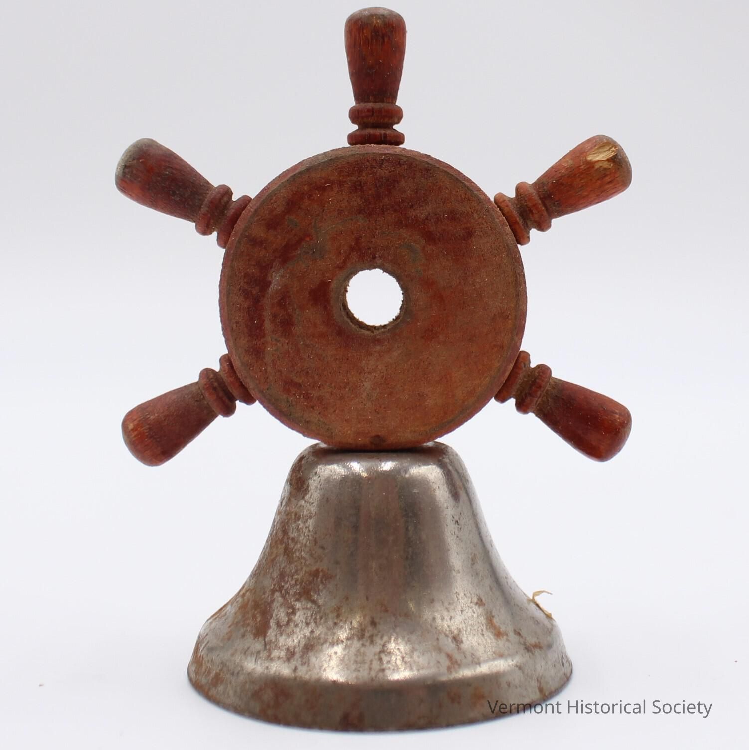 Small metal bell with a ship's wheel as a handle. The handle consists of a red-stained wooden disc with a hole in the center, and five turned handles spaced equidistant around the edges.