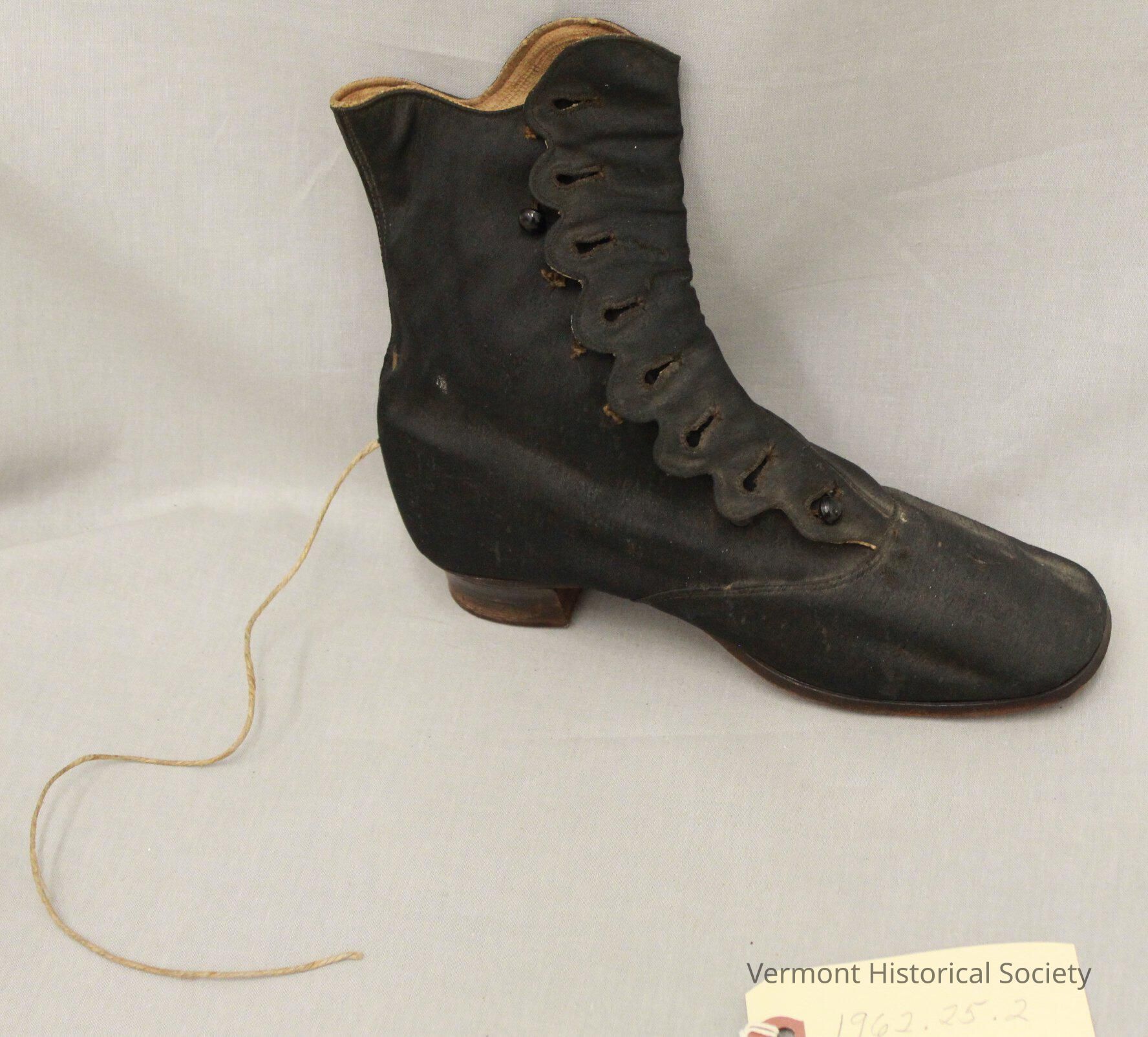 Small, black silk boot with a short heel. The boot buttons up the front right with 8 black wooden buttons, with the top reaching over the wearer's ankle. The upper is lined with leather. The sole is leather, and the heel is stacked leather. The shoe has a round, slightly boxy toe.