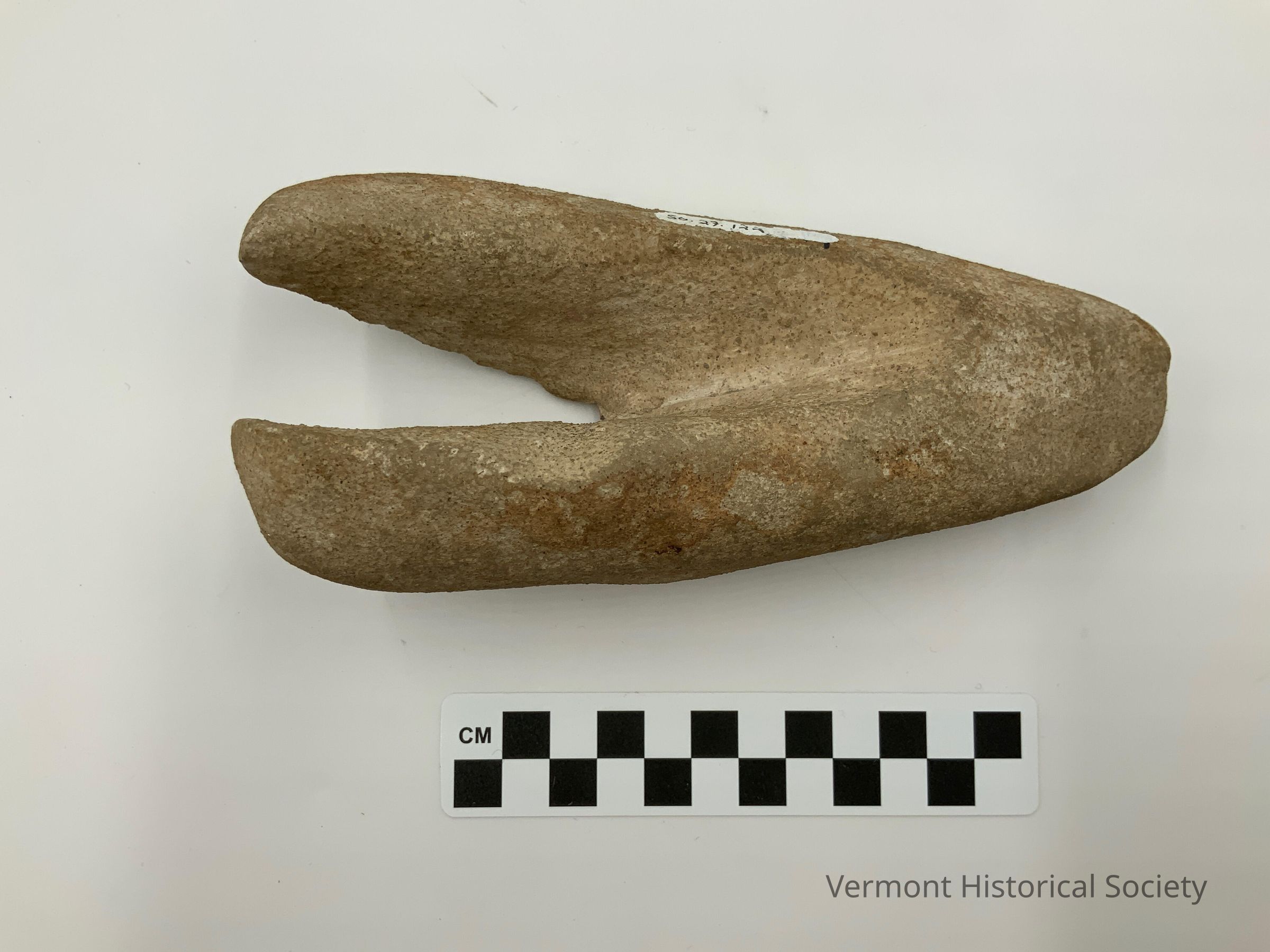 Ground stone tool shaped like a lobster claw. The stone is ground to form two points with a groove in the center. There is a groove near the base as well.Context