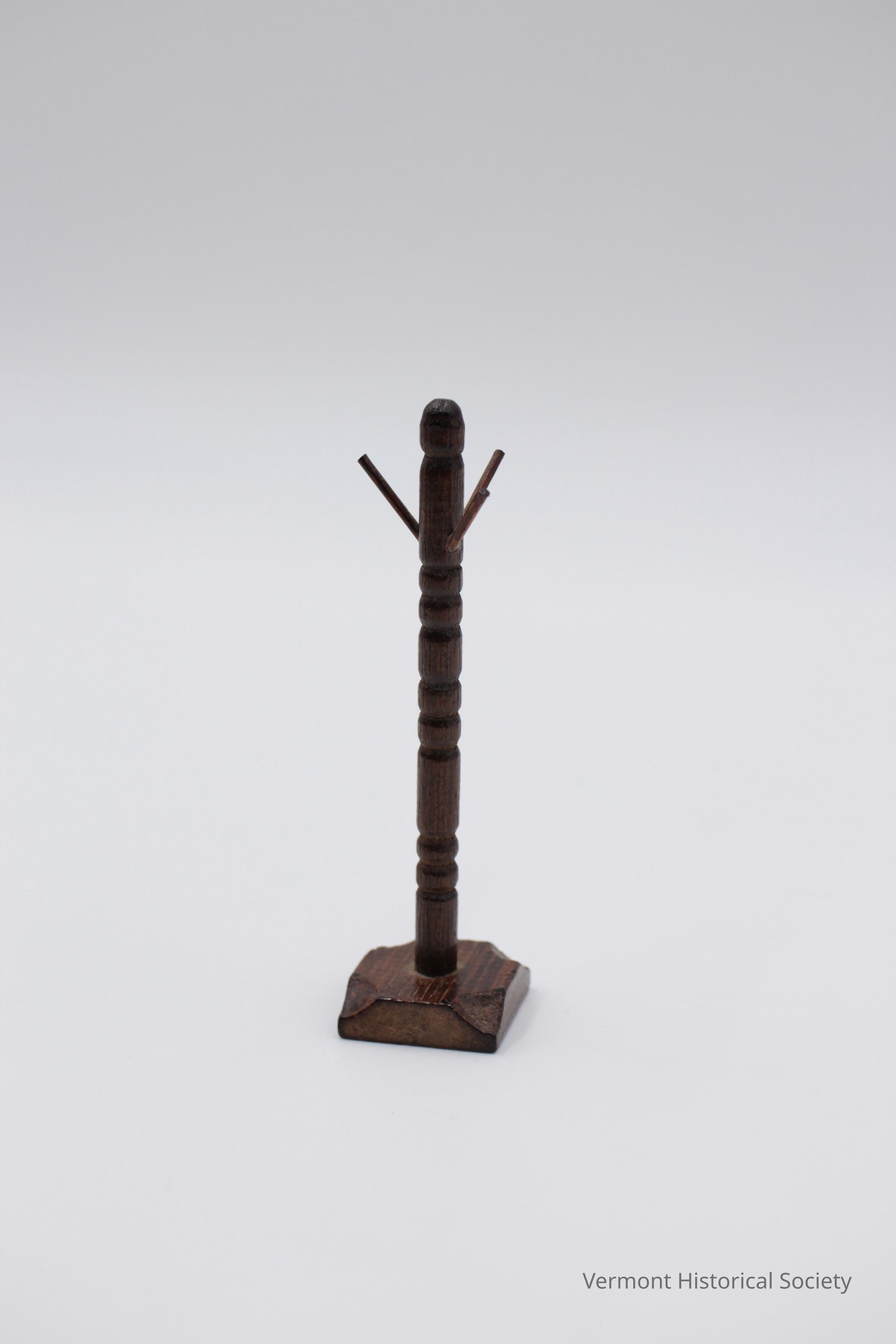 Miniature wooden coat rack consisting of a square base, a wooden post, and three pegs. The rack is accompanied by its original box, which is printed with a line drawing of the piece and the words, "HELLO DOLLY / MINIATURE CLOTH THREE / ITEM NO. 6449 / 1 PC MADE IN TAIWAN".Context
