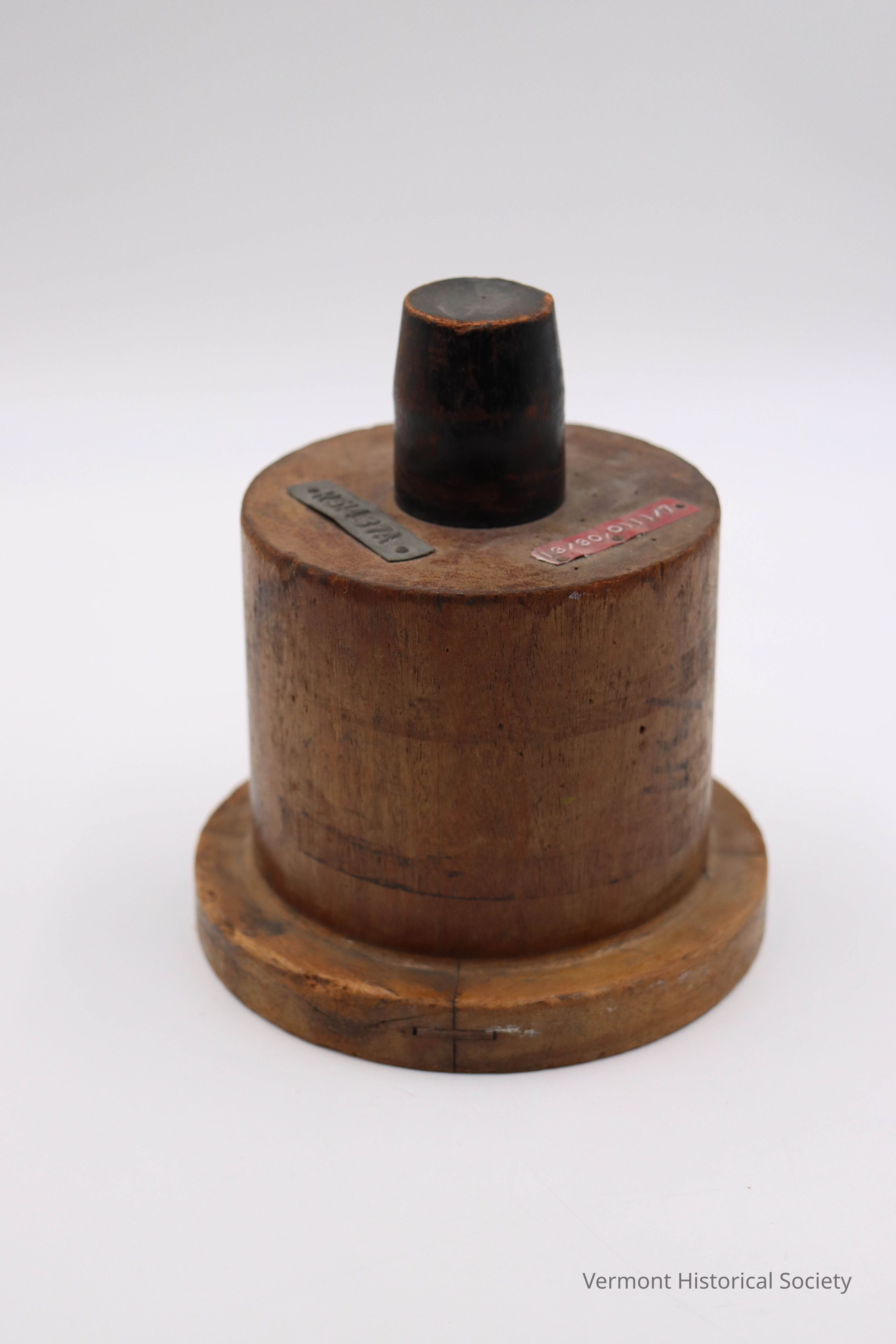 Large wooden spool with a wide base and a conical extension at the top. It 2 stamped metal labels with parts numbers.