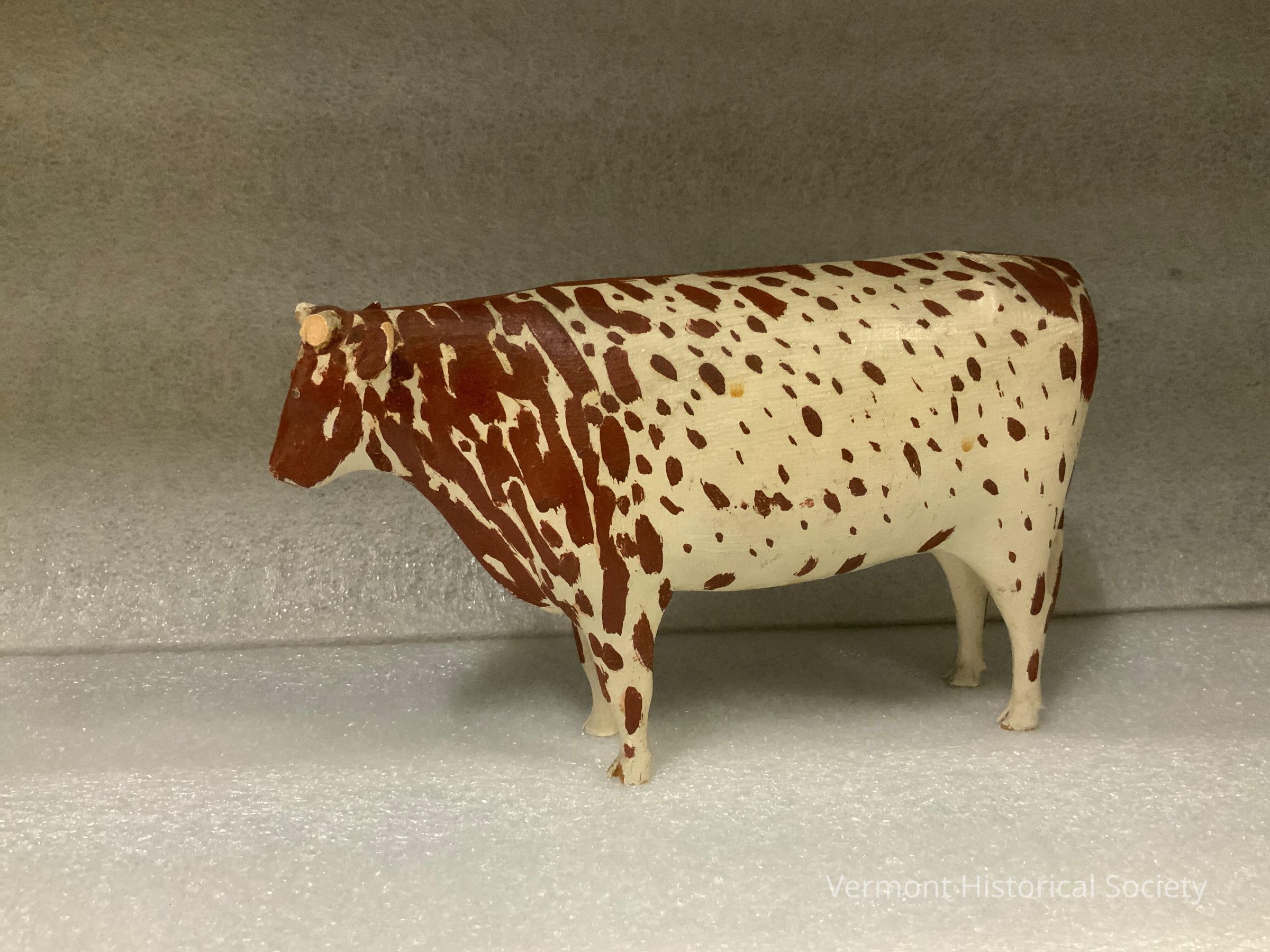 Carved wooden ox. The ox is white spotted with brown. It has short, narrow legs and a wide body.
