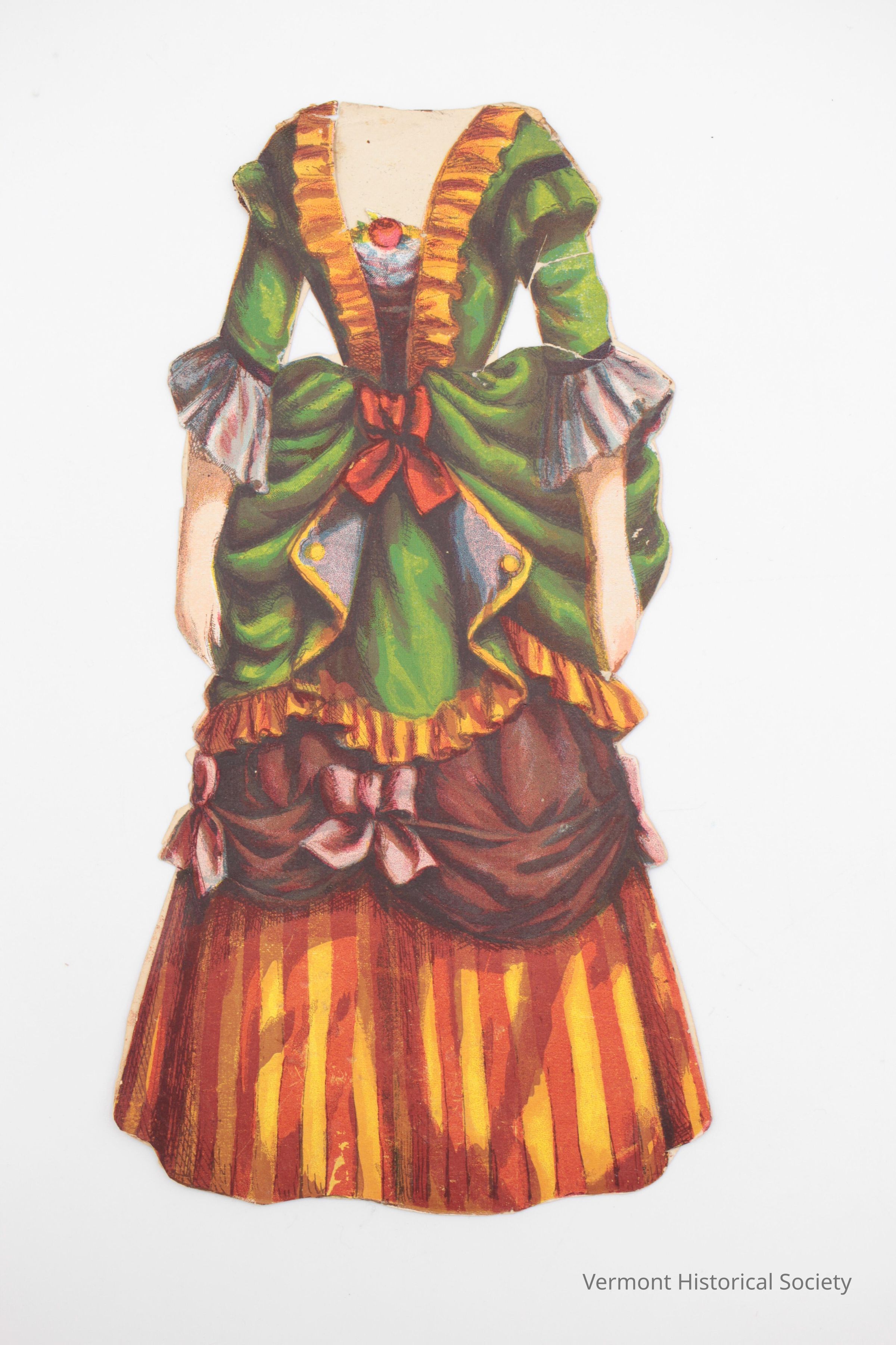 Two-sided dress for a paper doll. The bodice of the dress is green trimmed with yellow and has a square neckline. The skirt is red and yellow striped under a green overskirt and purple overskirt. The other side of the dress shows the dress from the back, including an elaborately draped bustle. The two sides are connected at the shoulder to fit over the doll.Acquisition