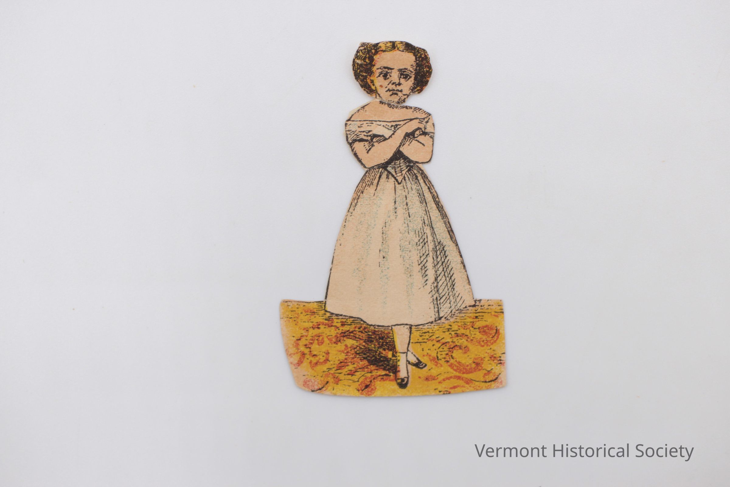Tiny paper doll of Lavinia Warren. The doll shows a woman with blond hair wearing a white corset and petticoat with her arms crossed in front of her. The base is a yellow and red carpet.Context