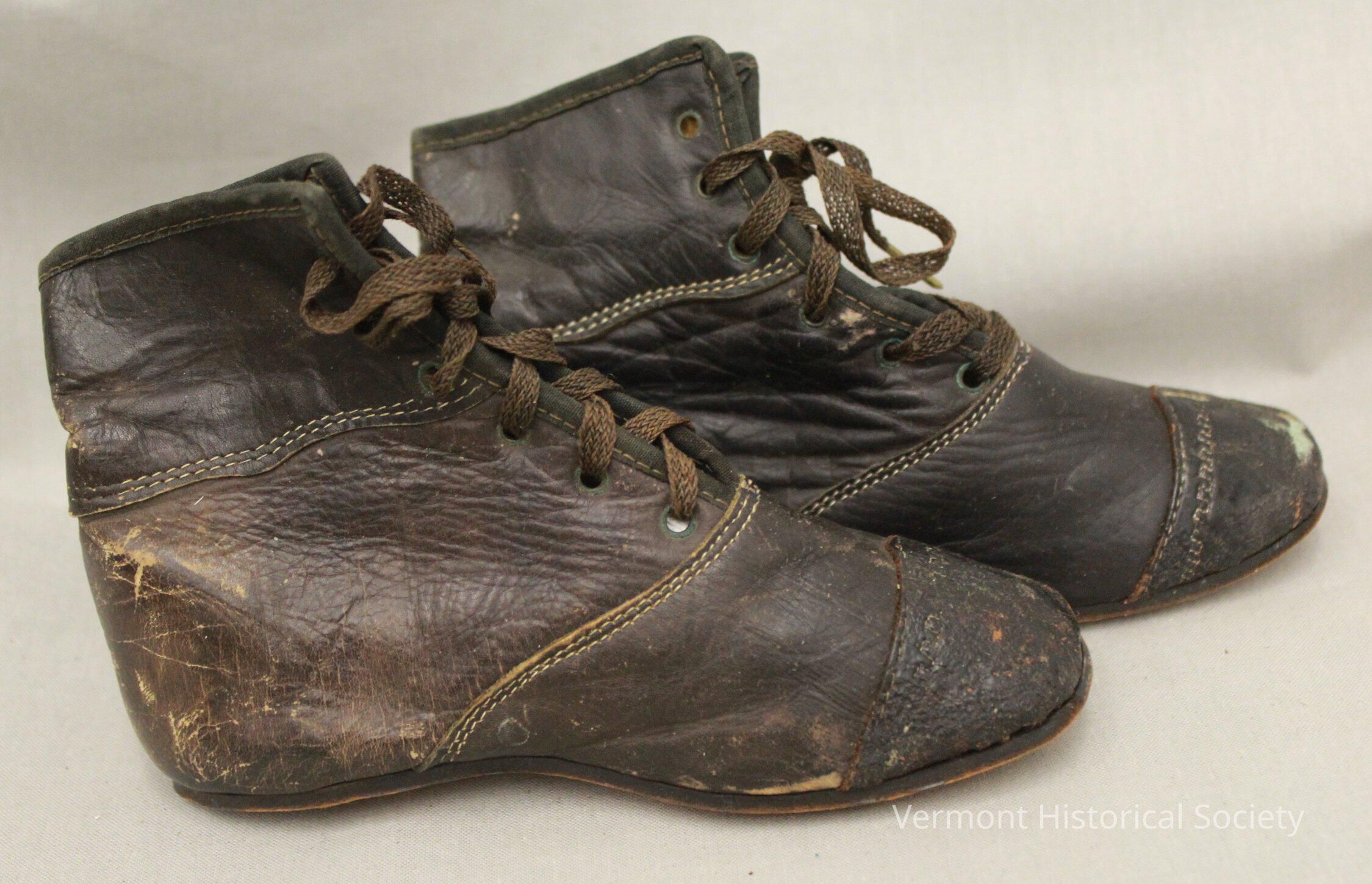 Brown leather child's boots. They lace up the center front and reach above the wearer's ankle. The shoes are straight cut with leather soles. There are no heels.