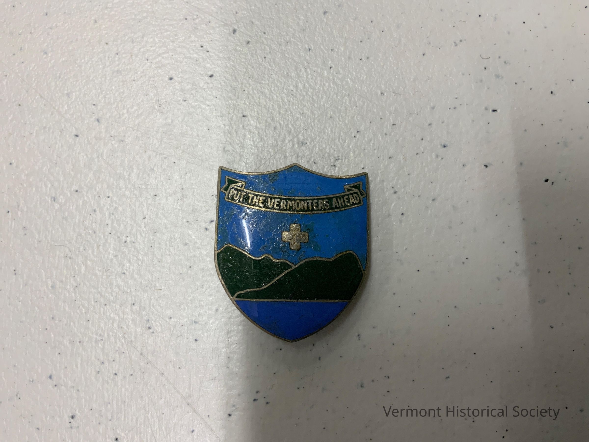 Shield-shaped enameled pin with two green mountains over a blue ground. There is a silver cross with even spokes above the mountains, and a banner at the top reads, "PUT THE VERMONTERS AHEAD".