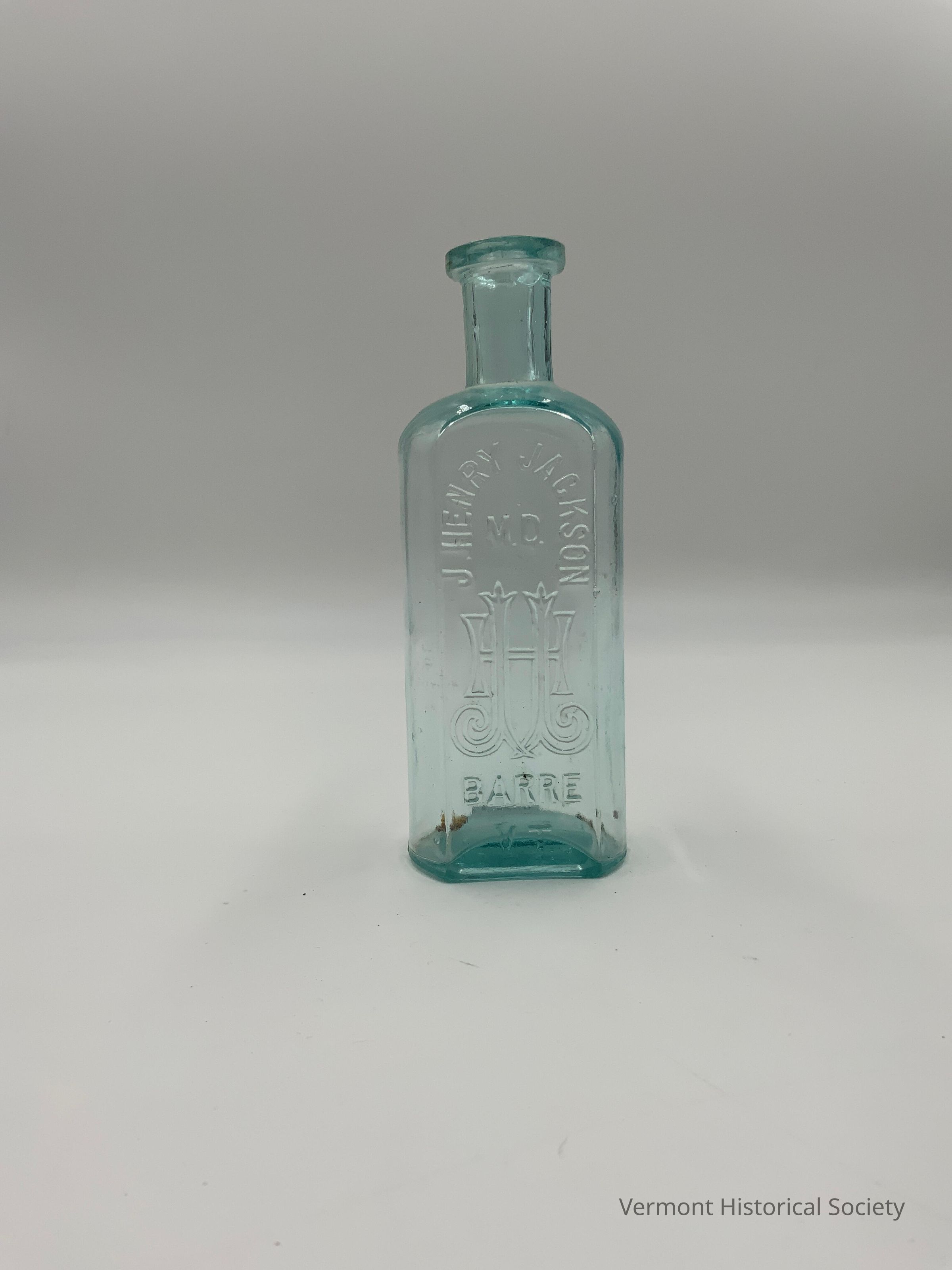 Green glass medicine bottle with the molded inscription, "J. HENRY JACKSON / M.D. / BARRE VT." surrounding a monogram consisting of two Js, one backward and one forward, above the letter H.