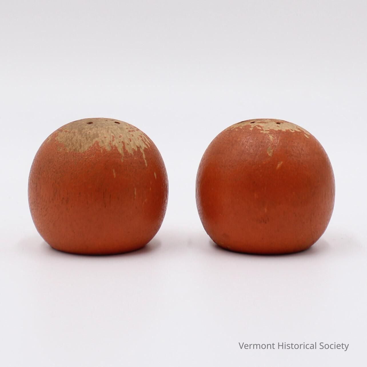 Two, round turned-wood shalt shakers. The shakers are painted orange.