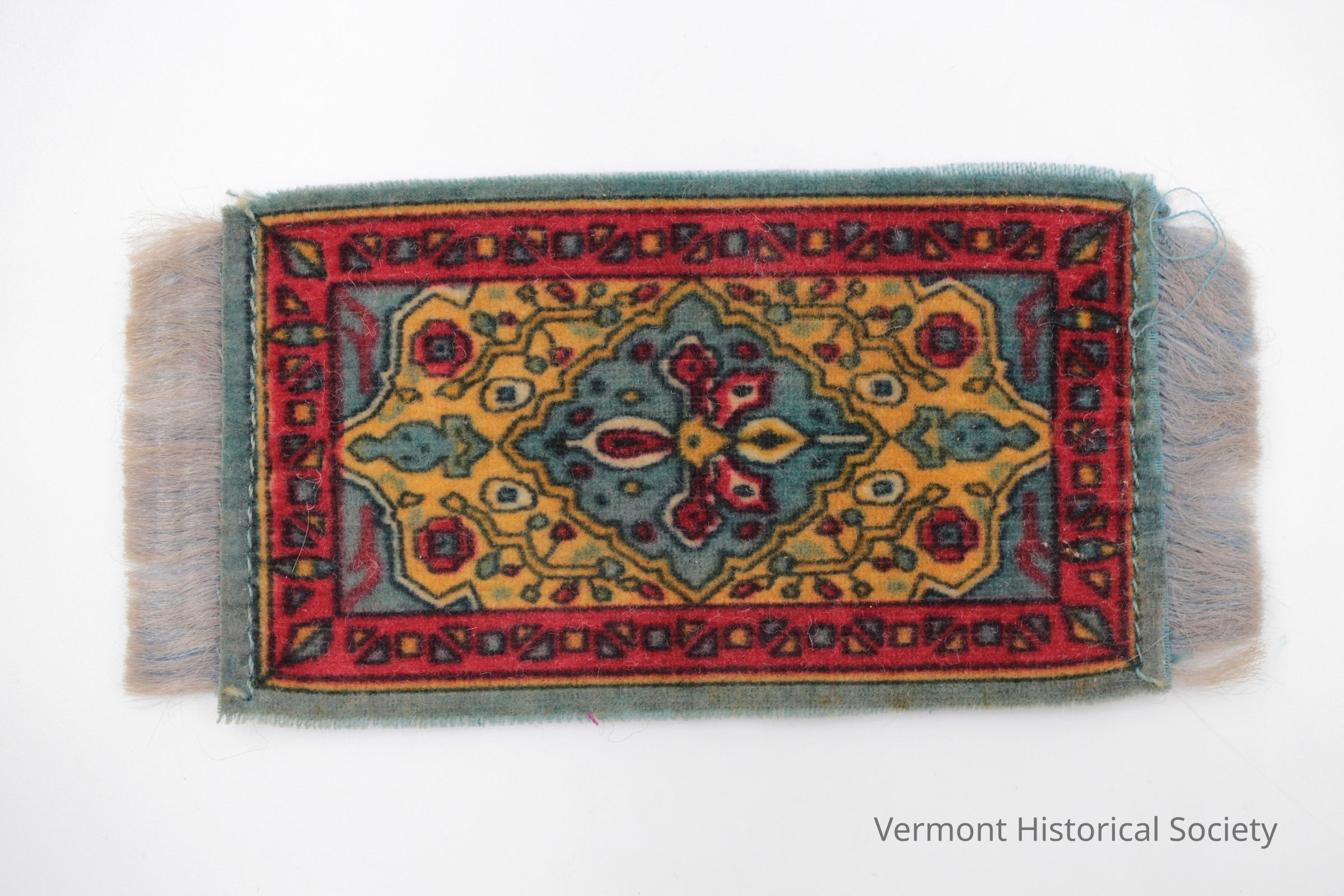 Miniature rug sized for a dollhouse. The rug is printed with an eastern-inspired design in red, blue, and yellow with a central medallion. There is blue fringe stitched to each short edge of the rug.Context