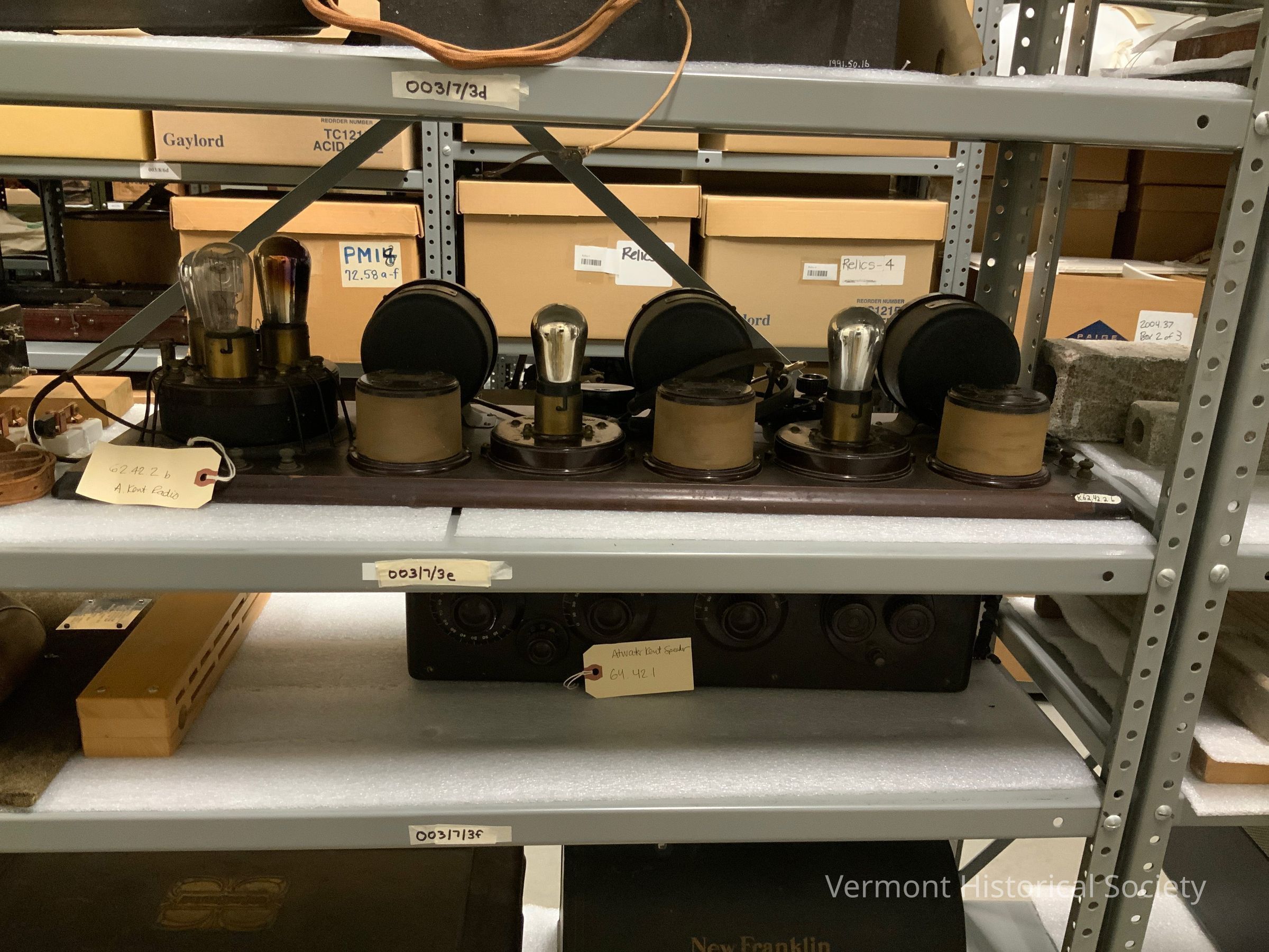 Atwater Kent radio, 1923 type 5a, and headphones. The radio consists of a wooden board with beveled edges. On the surface, six different size cylindrical pieces are attached to a rectangular wooden slab with a concave curved trim. From the left, the largest cylinder has about six knobs attached to rubber covered wires that connect with the wooden slab. Three lightbulbs with chrome-like globes extend from the top and are showing some blackening inside the bulb. The metal label has a red circle in the center with gold lettering that says “AK” with “MADE IN THE U.S.A.” below the circle. The label reads, “ATWATER KENT / PHILA. TYPE TA / PATENTS PENDING / DETECTOR AND 2 STAGE A.F. AMPLIFIER. The next four cylinders alternate between a tall cylinder and squat cylinders with a silver painted light bulb attached. Three dials read 100 to 0 from left to right. The metal headphones connect to the largest cylinder and reads “FROST FONES / NO. 163 / 1500” on the speakers.