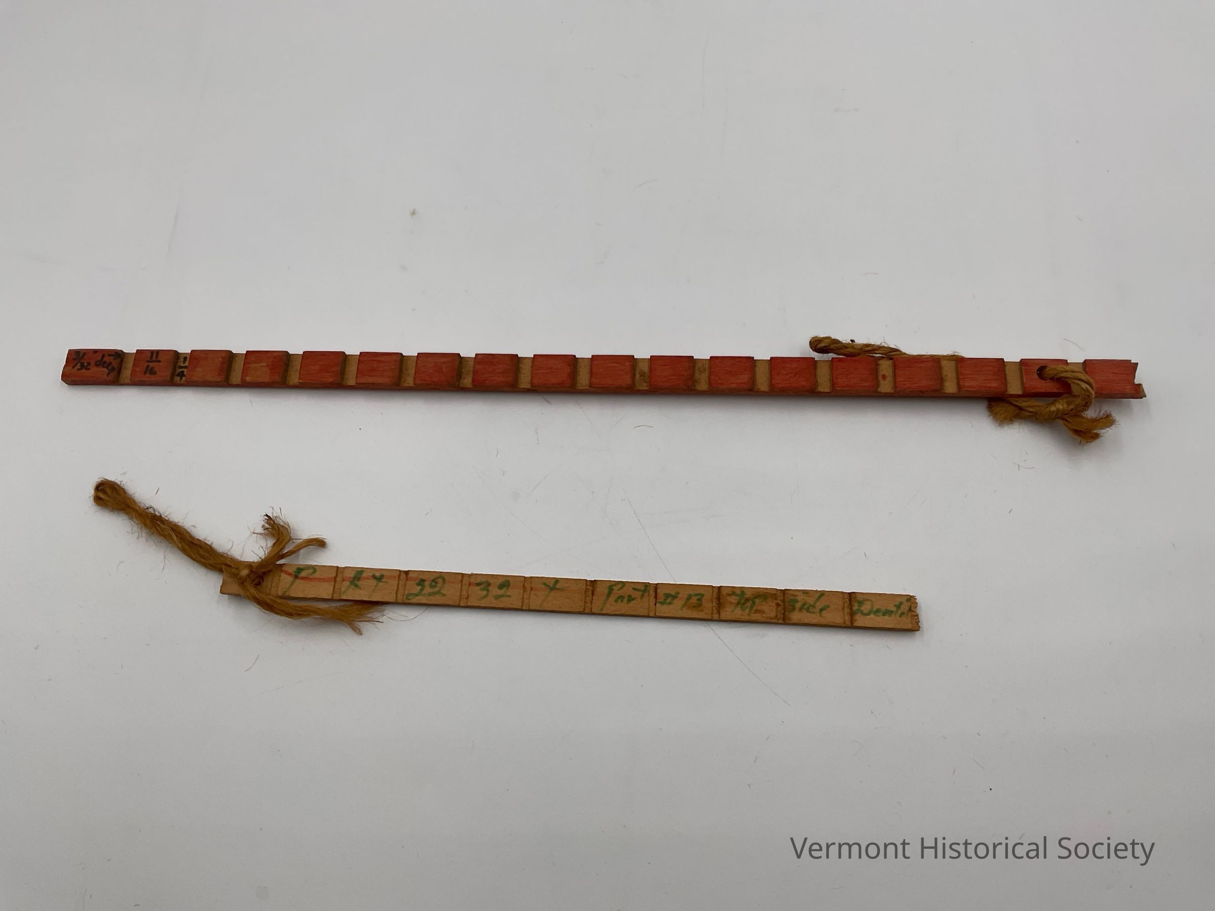 Two flat sticks described as stacking group dentils, each with evenly spaced cutouts along their length. One is colored red.Context